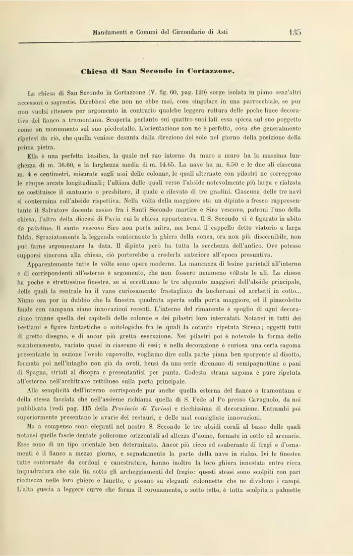 La chiesa di San Secondo in Cortazzone (V. fig. 00, pag. 120) sorge isolata in piano senz'altri accessori o sagrestie. Direbhesi che non ne ebbe mai, cosa singolare ili una parrocchiale, se pur non vuoisi ritenere per argomento in contrario qualche leggera rottura delle ppche linee decorative del fianco a tramontana. Scoperta pertanto sui quattro suoi lati essa spicca sul suo poggetto come un monumento sul suo piedestallo. L'orientazione non ne è perfetta, cosa che generalmente ripetesi da ciò, che quella venisse desunta dalla direzione del sole nel giorno della posizione della prima pietra.