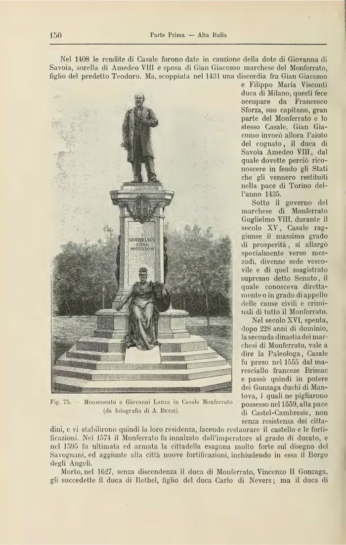 Nel secolo XVI, spenta, dopo 228 anni di dominio, la seconda dinastia dei marchesi di Monferrato, vale a dire la Paleoioga, Casale fu preso nel 1555 dal maresciallo francese Brissac e passò quindi in potere dei Gonzaga duchi di Mantova, i quali ne pigliarono Fig. 75. — Monumento a Giovanni Lanza in Gasale Monferrato possesso nel 1559 alla pace (da fotografia di A. Bensì). di Castel-Cambresis, non