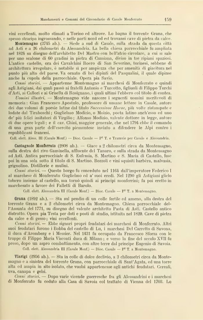 Viarigi (2956 ab.). — Sta in colle di dolce declivio, a 3 chilometri circa da Monte-magno e a sinistra del torrente Grana, con parrocchiale di Sant'Agata, ed una torre alta ed ampia in sito isolato, che vuoisi appartenesse agli antichi feudatari. Cereali, uva, canapa e gelsi.