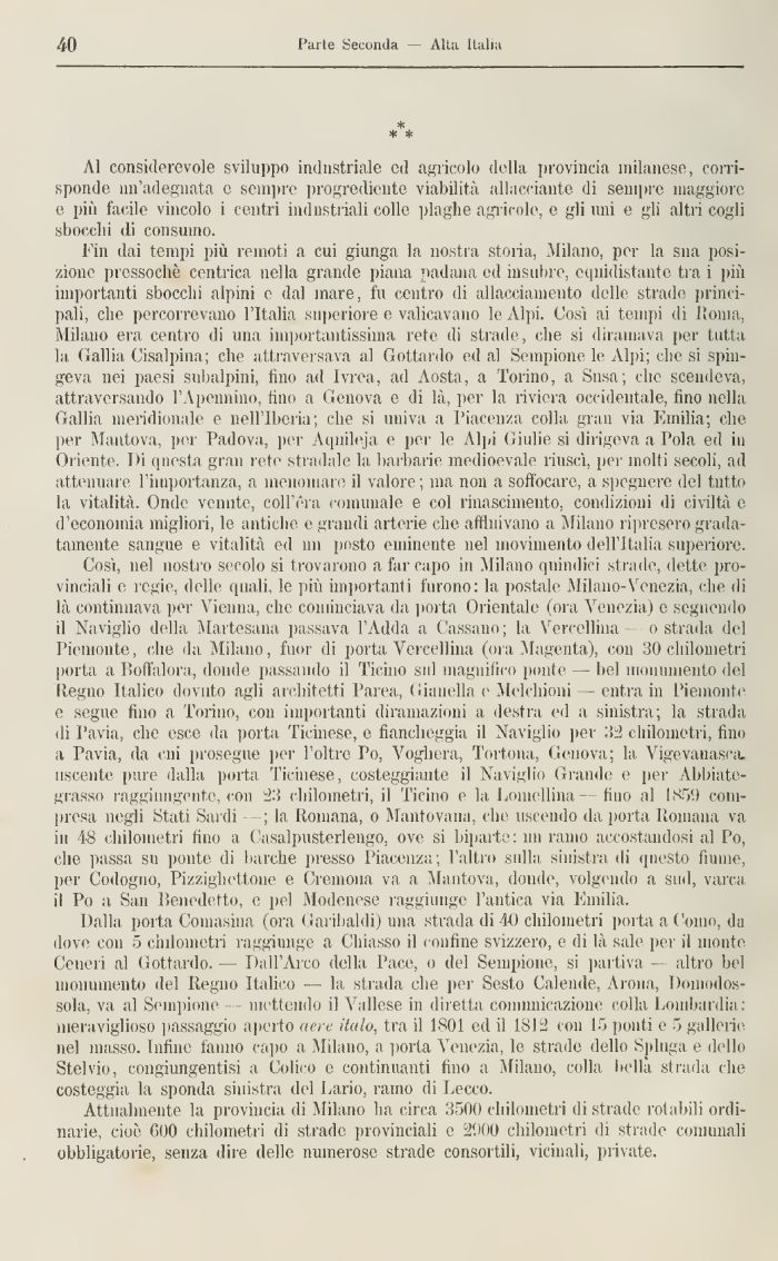 fin dai tempi più remoti a cui giunga la nostra storia, Milano, per la sua posizione pressoché centrica nella grande piana padana ed insubre, equidistante tra i pili importanti sbocchi alpini e dal mare, fu centro di allacciamento delle strade principali, che percorrevano l'Italia superiore e valicavano le Alpi. Cosi ai tempi di Iìonia, Milano era centro ili una importantissima rete di strade, che sì diramava per tutta la Gallia Cisalpina; che attraversava al Gottardo ed al Senipione le Alpi; che si spìngeva nei paesi subalpini, fino ad Ivrea, ad Aosta, a Torino, a Snsa; clic scendeva, attraversando Impennino, fino a Genova e di là, per la riviera occidentale, fino nella Gallia meridionale e neiriberia; che si univa a Piacenza colla gran via Emilia; che per Mantova, per Padova, per Aqnileja e per le Alpi Giulie si dirigeva a Pola ed in Oriente. Di questa gran rete stradale la barbarie medioevale riuscì, per molti secoli, ad attenuare l'importanza, a menomare il valore ; ma non a soffocare, a spegnere del tutto la vitalità. Onde venute, coll'éra comunale e col rinascimento, condizioni di civiltà e (l'economia migliori, le antiche e grandi arterie che affluivano a Milano ripresero gradatamente sangue e vitalità ed 1111 posto eminente nel movimento dell'Italia superiore.