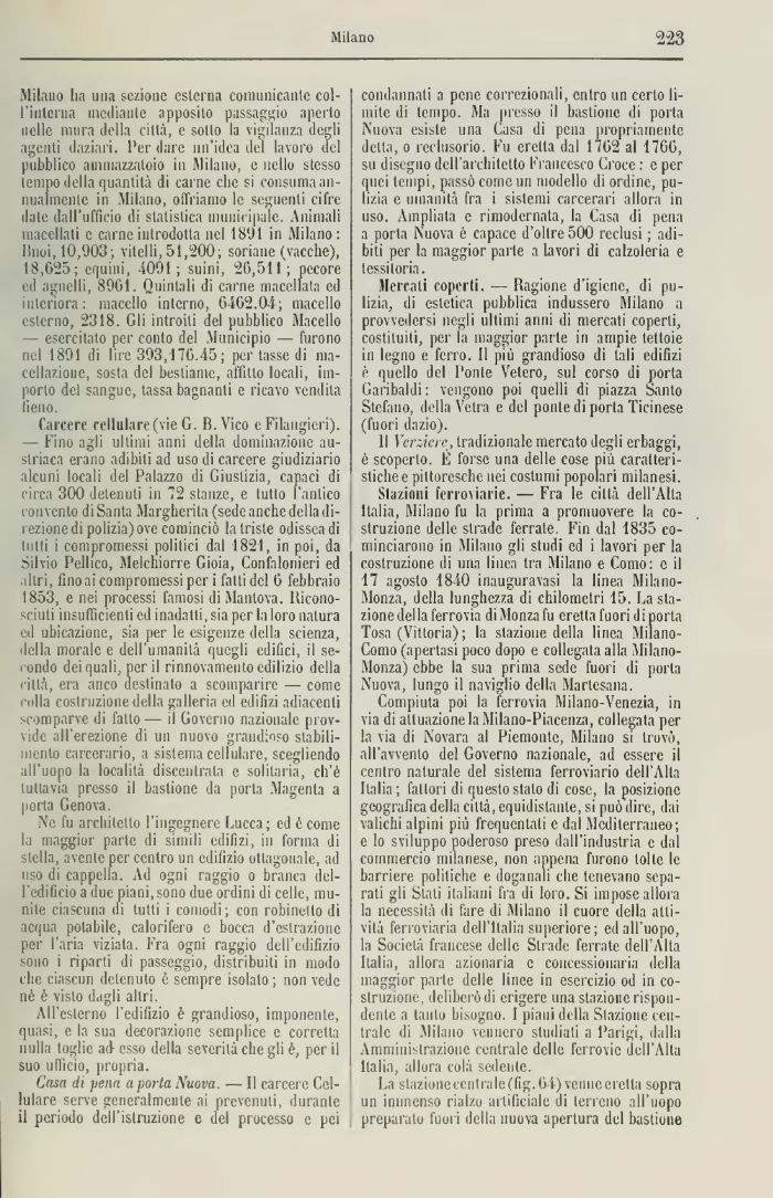 Carcere cellulare (vie G. 13. Vico e Filangieri). — Fino agli ultimi anni della dominazione austriaca erano adibiti ad uso di carcere giudiziario alcuni locali del Palazzo di Giustizia, capaci di circa 30(J detenuti in 72 stanze, e lutto l'antico convento di Santa Margherita (sede anche della dilezione di polizia) ove cominciò la triste odissea di lulti i compromessi politici dal 1821, in poi, da Silvio Pellico, Melchiorre Gioia, Gonfalonieri ed diri, finoat compromessi per i fatti del 6 febbraio 1853, e nei processi famosi di Mantova. Riconosciuti insufficienti ed inadatti, sia per la loro natura ed ubicazione, sia per le esigenze della scienza, della morale e dell'umanità quegli edifici, il secondo dei quali, perii rinnovamento edilizio della eillà, era anco destinato a scomparire — come colla costruzione della galleria ed edilizi adiacenti scomparve di fatto — il Governo nazionale provvide all'erezione di un nuovo grandioso stabilimento carcerario, a sistema cellulare, scegliendo all'uopo; la località disccntrala e solitaria, cli'è tuttavia presso il bastione da porta Magenta a porta Genova.