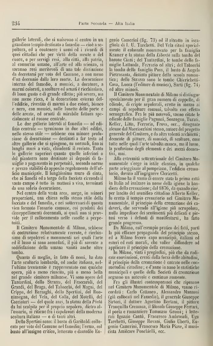 genio Camerini (fig. 73) ed il ritratto in isca-gliola di I. I.J. Tarchetti. Del Vela citasi specialmente il colossale monumento per la famiglia Kramcr e la statua della Liberia sulla tomba nel barone Ciani ; del Tantardini, le tombe delle famiglie Lattuada, Ferrario ed altri , del Tabacchi la tomba della famiglia Poss, il busto di Angelo Pietrosanla, distinto pittore della scuola romantica; dello Strazza sono le tombe Chierichetti-Cova, Lucca (l'editore di musica), Sarti (fig. li) ed altre minori.