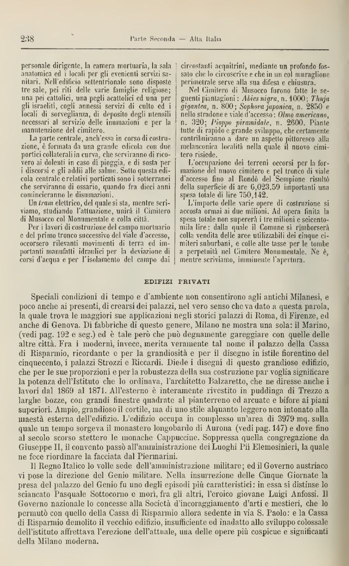Speciali condizioni di tempo e d'ambiente non consentirono agli antichi Milanesi, e poco anche ai presenti, di crearsi dei palazzi, nel vero senso clic va dato a questa parola, la quale trova le maggiori sue applicazioni negli storici palazzi di Roma, di Firenze, ed anche di Genova. Di fabbriche di questo genere, Milane ne mostra una sola: il Marino, (vedi pag. 192 e seg.) ed è tale però che può degnamente gareggiare con quelle delle altre città. Fra i moderni, invece, merita veramente tal nome il palazzo della Cassa di Risparmio, ricordante e per la grandiosità e per il disegno 111 istile fiorentino del cinquecento, i palazzi Strozzi e Riccardi. Diede i disegni dì questo grandioso edilìzio, che per le sne proporzioni e per la robustezza della sua costruzione par voglia significare la potenza dell'Istituto che lo ordinava, l'architetto Iialzaretto, che ne diresse anche i lavori dal 1809 al 1871. All'esterno è interamente rivestito in puddinga di 'Prezzo a larghe bozze, con grandi finestre quadrate al pianterreno ed arcuate e bifore ai piani superiori. Àmpio, grandioso il cortile, ma di uno stile alquanto leggero non intonato alla maestà esterna dell'edilizio. L'edilìzio occupa 111 complesso 1111'area di 3979 mq. sulla quale un tempo sorgeva il monastero longobardo di Aurona (vedi pag. 147) e dove fino al secolo scorso stettero le monache Cappuccine. Soppressa quella congregazione da Giuseppe II, il convento passò all'amministrazione dei Luoghi I'ii Elemosinieri, la quale ne fece riordinare la facciata dal Pìermarini.