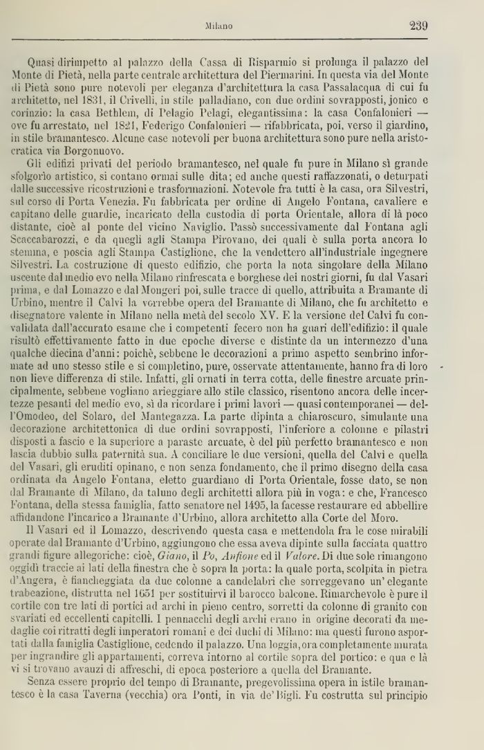 Gli edilizi privati del periodo bramantesco, nel quale fu pure in Milano sì grande sfolgorìo artistico, si contano ormai sulle dita; ed anche questi raffazzonati, o deturpati dalle successive ricostruzioni e trasformazioni. Notevole fra tutti è la casa, ora Silvestri, sul corso di Porta Venezia. Fu fabbricata per ordine di Angelo Fontana, cavaliere e capitano delle guardie, incaricato della custodia ili porta Orientale, allora di là poco distante, cioè al ponte del vicino Naviglio. Passò successivamente dal Fontana agli Scaccabarozzi, e da quegli agli Stampa Pirovano, dei quali è sulla porta ancora lo stemma, e poscia agli Stampa Castiglione, che la vendettero all'industriale ingegnere Silvestri. La costruzione di questo edilizio, che porta la nota singolare della Milano uscente dal medio evo nella Milano rinfrescata e borghese dei nostri giorni, fu dal Vasari prima, e dal Lomazzo e dal Mongeri poi, sulle tracce di quello, attribuita a Bramante di Urbino, mentre il Calvi la vorrebbe opera del Bramante di Milano, che fu architetto e disegnatore valente in Milano nella metà del secolo XV. E la versione del Calvi fu convalidata dall'accurato esame che i competenti fecero non ha guari dell'edilìzio: il quale risultò effettivamente fatto in due epoche diverse e distinte da un intermezzo d'una qualche diecina d'anni : poiché, sebbene le decorazioni a primo aspetto sembrino informate ad uno stesso stile e si completino, pure, osservate attentamente, hanno fra ili loro -non lieve differenza di stile. Infatti, gli ornati in terra cotta, delle finestre arcuate principalmente, sebbene vogliano arieggiare allo stile classico, risentono ancora delle incertezze pesanti del medio evo, sì da ricordare i primi lavori — quasi contemporanei — del-l'Omodeo, del Solaro, del Mantegazza. La parte dipinta a chiaroscuro, simulante una decorazione architettonica di due ordini sovrapposti, l'inferiore a colonne e pilastri disposti a fascio e la superiore a paraste arcuate, è del più perfetto bramantesco e non lascia dubbio sulla paternità sua. A conciliare le due versioni, quella del Calvi e quella del Vasari, gli eruditi opinano, e non senza fondamento, che il primo disegno della casa ordinata da Angelo Fontana, eletto guardiano di Porta Orientale, fosse dato, se non dal Bramante di Milano, da taluno degli architetti allora più in voga: e che, Francesco Fontana, della stessa famiglia, fatto senatore nel 1495, la facesse restaurare ed abbellire affidandone l'incarico a Bramante d'Urbino, allora architetto alla Corte del Moro.