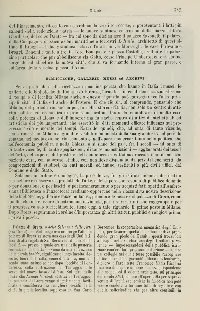 0 per donazione, 0 per lasciti, 0 per incameramento 0 per acquisti fatti spetti all'Ambrosiana (Biblioteca e Pinacoteca) crediamo opportuno nella riassuntiva nostra descrizione delle biblioteche, gallerie e musei milanesi, prendere le mosse dal palazzo di Brera, come quello, che oltre essere di patrimonio nazionale, per i vari istituti che raggruppa e per il progressivo suo arricchimento, tiene oggi a tale riguardo il primo posto in Milano. Dopo Brera, seguiranno 111 ordine d'importanza gli altri istituti pubblici e religiosi prima,