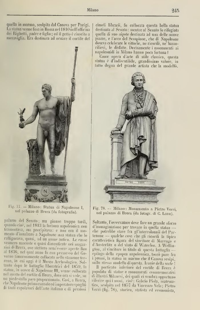 Il porticato inferiore del cortile di licci a è popolalo di stallie e monumenti commemorativi di illustri Milanesi, dei quali ci sembra opportuno riferire quii nomi, cioè: Gabrio Piola, matematico, scolpita nel 18Ó7 da Vincenzo Vela; Pietro N'erri (fig. 78), storico, statista ed economista,