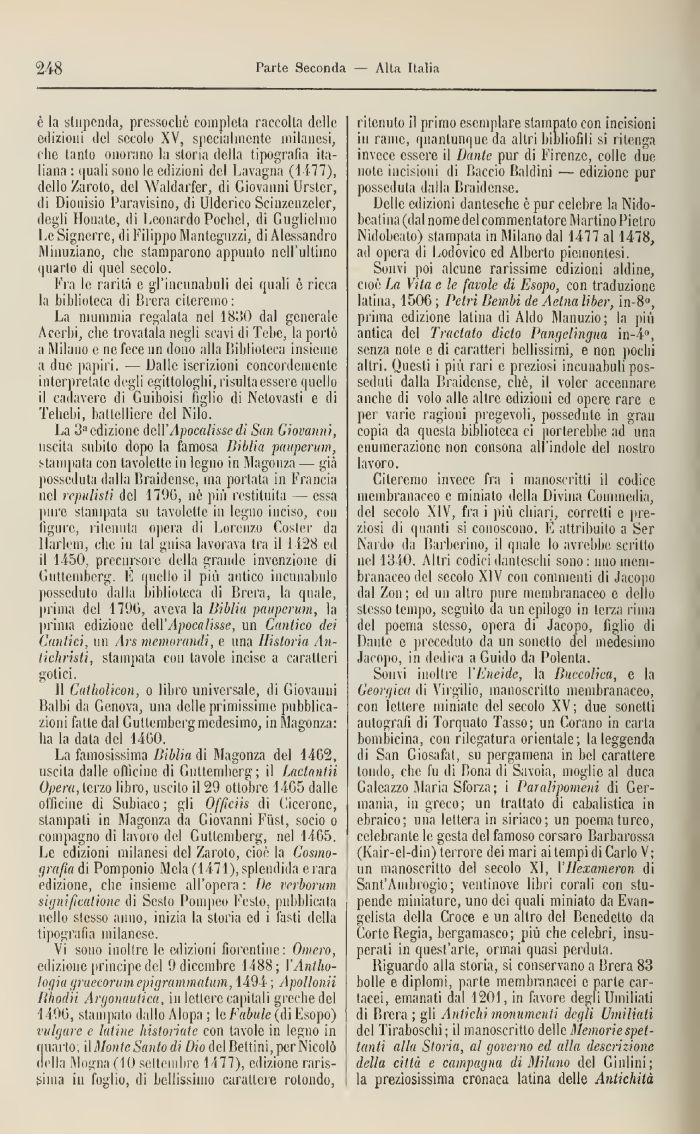 Solivi poi alcune rarissime edizioni aldine, cioè La Vita, e le favole di Esopo, con traduzione latina, 1506; L'etri Ilembi de Aetna li ber, in-8, prima edizione latina ili Aldo Manuzio; la più antica del Tractato dicto l'angelingua in-4°, senza note e di caratteri bellissimi, e non pochi altri. Onesti i più rari e preziosi incunabuli posseduti dalla Braidense, che, il voler accennare anche di volo alle, altre edizioni ed opere rare e per varie ragioni pregevoli, possedute in gran copia da questa biblioteca ci porterebbe ad una enumerazione non consona all'indole del nostro lavoro.
