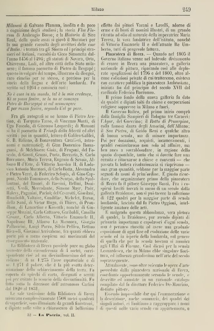 mimesi di Galvano Fiamma, inalila e da poco a cognizione degli studiosi ; la storia Flos Fio-rum di Ambrogio Bosso; e la I/istoria di Sire Raul, della quale assai si giovò il .Minatori per la sua grande raccolta degli sciittori delle cose d'Italia, i trattati tra gli Sforza ed i principi stranieri ed italiani, raccolti da Cieco Simonetta dal l'anno Uuti al lì'.H; gli statuti di Novara, Urta, Chiaveima, Lodi, ed altre città dello Stato milanese; il famoso poemetto ili Pietro da Resgapè; questo in volgare del tempo, illustrato da disegni, raro cimelio per se stesso, e prezioso per la storia della lingua e dell'arte lombarda. Fu scritto nel 1201 e comincia cosi :