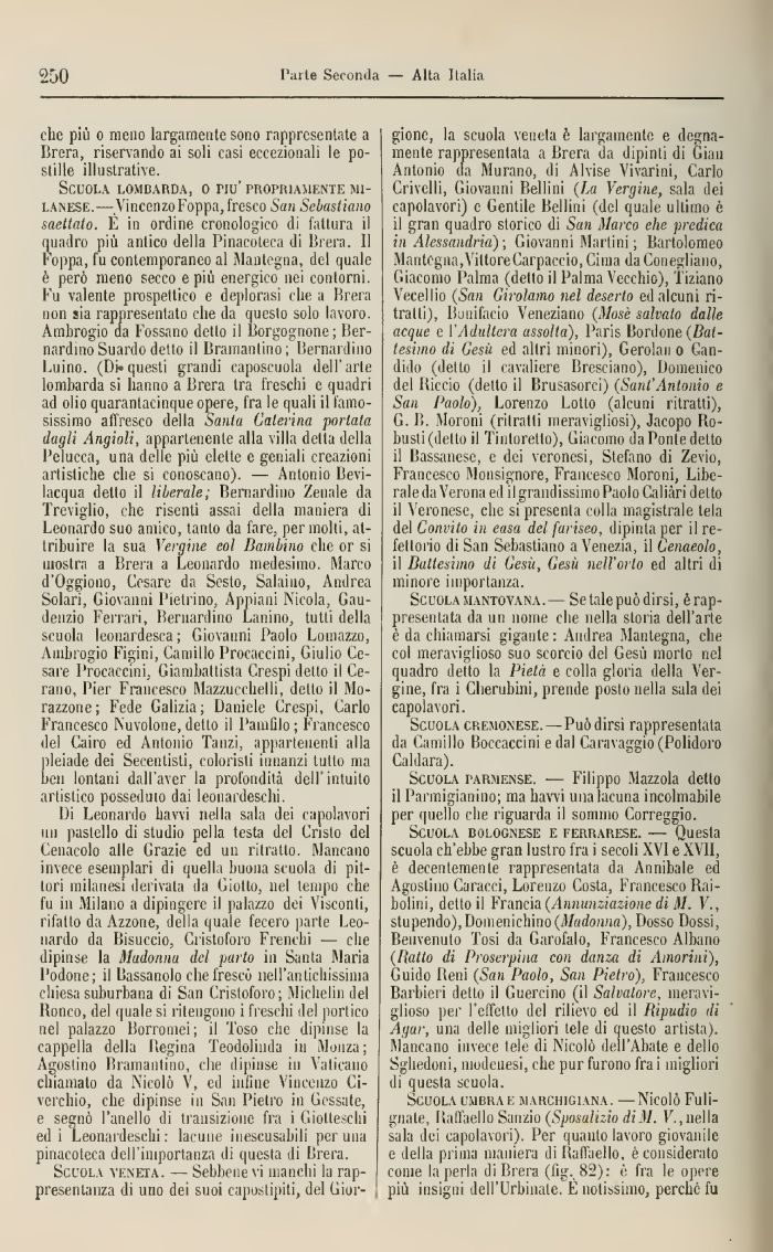 Scuola lombarda, o riu' propriamente milanese.—Vincenzo Foppa, fresco San Sebastiano saettato. É in ordine cronologico di fattura il quadro più antico della Pinacoteca di Brera. Il Poppa, fu contemporaneo al Mantegna, del quale è però meno secco e più energico nei contorni. Fu valente prospettico e deplorasi che a Brera non sia rappresentato che, da questo solo lavoro. Ambrogio da Possano detto il Borgognone; Bernardino Suardo detto il Bramauliuo ; Bernardino Ialino. (Di»questi granili caposcuola dell'arie lombarda si hanno a Brera tra freschi e quadri ad olio quarantacinque opere, fra le quali il famosissimo affresco della Santa Caterina portata dagli Angioli, appartenente alla villa detta della Pelucca, una delle più elette e geniali creazioni artistiche clic si conoscano). — Antonio Bevilacqua detto il liberale; Bernardino Zonale da Treviglio, che risentì assai della maniera di Leonardo suo amico, tanto da fare, per molti, attribuire la sua Vergine eoi Bambino che or si mostra a Brera a Leonardo medesimo. Marco d'Oggioiio, Cesare da Sesto, Sabino, Andrea Solari, Giovanni Pietrine, Appiani Nicola, Gaudenzio Ferrari, Bernardino Lanino, tutti della scuola leonardesca; Giovanni Paolo Lomazzi!, Ambrogio Figini, Camillo Procaccini, Giulio Cesare Procaccini, Giambattista Crespi detto il Cerano, Pier Francesco Mazzucchelli, detto il Mu-razzone; Fede Galizia; Daniele Crespi, Carlo Francesco Nuvolone, detto il l'aiutilo ; Francesco del Cairo ed Antonio Tauzi, appartenenti alla pleiade dei Secentisti, coloristi innanzi tutto ma ben lontani dall'avcr la profondità dell intuito artistico posseduto dai leonardeschi.