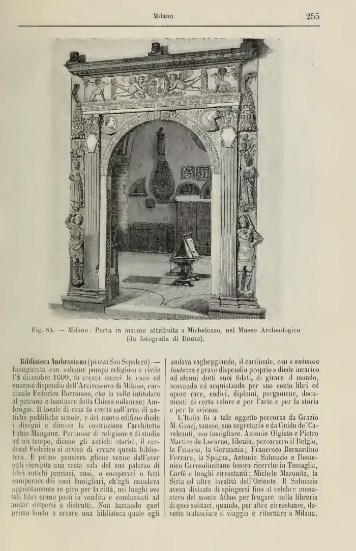 biblioteca hnlirosiami(piazza San Sepolcro) — Inaugurata con solenne pompa religiosa e civile PS dicembre IOOU, fu cicuta mercé le cure ed enormedispeiidio dell'Arcivescovo di Milano, cardinale Federico Borromeo, che la volle intitolare al patrono e luminare della Chiesa milanese: Ambrogio. Il locale di essa fu eretto sull'area di antiche pubbliche scuole e del nuovo edilìzio diede disegui e diresse la costruzione l'architetto Fabio Mangone. l'eranior di religione e di studio ad un tempo, dicono gli antichi storici, il cardinal Federico si avvisò di creare questa biblioteca. Il primo pensiero gliene venne dall'aver egli riempita una vasta sala del suo palazzo ili libri antichi preziosi, suoi, o comperati o fatti comperare dai suoi famigliari, ch'egli mandava appositamente in giro per la città, nei luoghi ove tali libri erano pusti in vendita e condannati ad andar dispersi o distrutti. Non bastando quel tiri ino fondo a creare una biblioteca quale egli