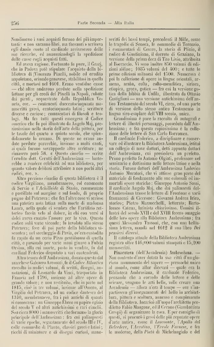 iti aveva ragione. Fortunato fu pure, il f!r;-.zi, die in Padova potè stipulare l'acquisto della biblioteca di -Vincenzo l'incili, nobile ed erudito napoletano, oriundo genovese, stabilitosi in quella citlà, e mortovi nel 4001. Erano ventiline casse — che altre andarono perdute nella spedizione fattane per gli eredi del l'incili in Napoli, rubate dai pirati, sequestrate dalla Repubblica Veneta, ecc. — contenenti ducccnlocinquaiita manoscritti greci, centocinquanta latini ; scritture diverse e curiose; commentari di filosofi e teologi. Ma fra tutti questi emergeva il Codice omero e clic fu poi illustrato da Angelo Maj, preziosissimo nella storia dell'arte della pittura, per le tavole del quarto o quinto secolo, che splendidamente lo ornano. Di queste ne erano andate perdute parecchie, insieme a molti canti, ii quali furono sovrapposte altre scritture; ne rimasero però 58. « Questo cimelio — scrive l'erudito doli. Cerniti dell'Ambrosiana — basterebbe a rendere celebrità ad una biblioteca, per quanto valore delibasi attribuire a non pochi altri codici, ecc. ».