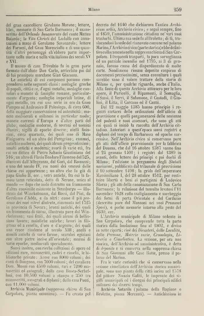 decreto del 1010 che dichiarava l'antico Arehi-vium urbis, Archivio civico ; c segui sempre, fino al 1850, l'amministrazione cittadina ne'vari suoi traslochi. Ultima sua sede fu al Broletto; di là, traslocandosi lasededel rinnovato comunenel palazzo Marino, l'Archi viocivic,o(pa rtestorica)ebbedefini-tivocollocamento nella soppressa chiesa di San Carpoforo. I frequenti trasporti, la poca sorveglianza ed un parziale incendio nel 1795, ai 3 di gennaio, furono causa del disperdimento di molte carte. Nondimeno rimase deposito cospicuo di documenti preziosissimi, senza consultare i quali sarebbe vano d volere trattare della storia di Milano e, pei' qualche riguardo, anche d'Italia. Alla fonte di questo Archivio attinsero per le loro opere, il Purieelli, il Ripamonti, il Somaglia, il Sassi, il Verri, il Salomone, il Custodi, il ( iu-lini, il Pitta, il Carcami ed il Cantù.