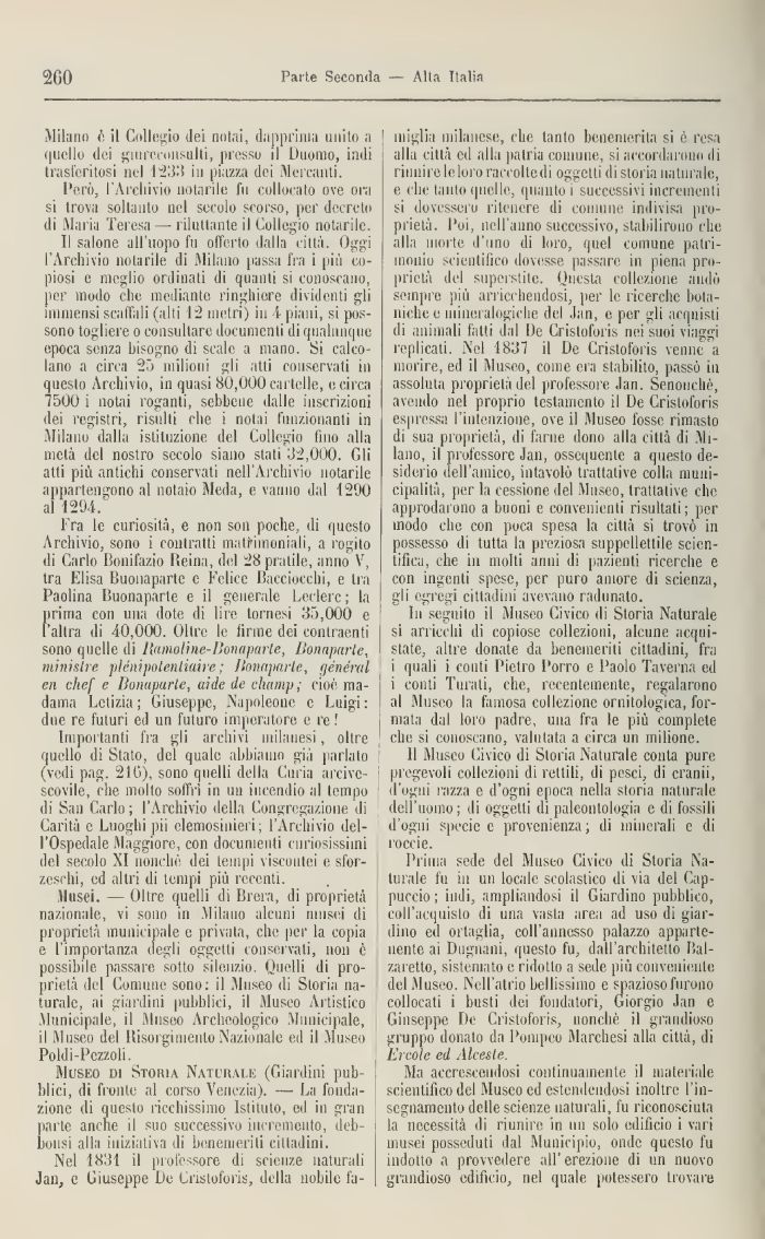 miglia milanese, che tanto benemerita si è resa alla città ed al Li patria connine, si accordarono ili riunire loloro raccoltedi oggetti di storia naturale, e che tanto quelle, quanto ì successivi incrementi si dovessero ritenere di comune indivisa proprietà. Poi, nell'anno successivo, stabilirono che alla morte d'uno di loro, quel comune patrimonio scientifico dovesse passare in piena proprietà del superstite. Onesta collezione andò sempre più arricchendosi, per le ricerche bota incile e mineralogiche del Jan, e per gli icqnisti ili animali fatti dal De Cristoforis nei suoi viaggi replicati. Nel 4837 il De Cristoforis venne a morire, ed il Museo, come era stabilito, passò in assoluta proprietà del professore Jan. Senoncliè, avendo nel proprio testamento d De Cristoforis espressa I intenzione, ove il Museo fosse rimasto di sua proprietà, di farne dono alla città di Milano il professore Jan, ossequente a questo desiderio dell'amico, intavolò trattative colla municipalità, per la cessione, del Museo, trattative clic approdarono a buoni e convenienti risultati; per modo che con poca spesa la città si trovò in possesso di tutta la preziosa suppellettile scicn-tiliea, che ili molti anni di pazienti ricerche e con ingenti spese, per puro amore di scienza, gli egregi cittadini avevano radunato.