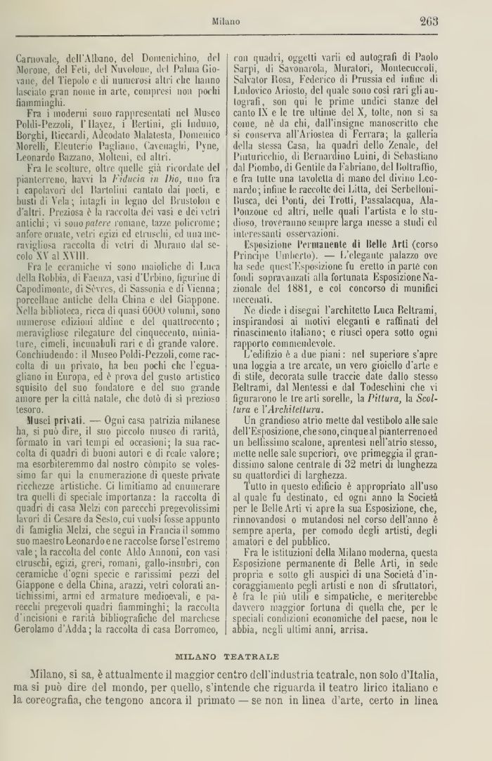 Musei privali. — Ogni casa patrizia milanese ha, si può dire, ii suo piccolo museo di rarità, formato in vari tempi ed occasioni; la sua raccolta di quadri di buoni autori e di reale valore; ma esorbiteremmo dal nostro compito se volessimo far qui la enumerazione di queste privale ricchezze artistiche. Ci limitiamo ad enumerare tra quelli di speciale importanza: la raccolta di quadri di casa Melzi con parecchi pregevolissimi lavori di Cesare da Sesto, cui vuoisi fosse appunto di famiglia Melzi, che segui in Francia il sommo suo maestro Leonardo e ne raccolse forse l'estremo vale ; la raccolta del conte Aldo Annoili, con vasi etruschi, egizi, greci, romani, gallo-insubri, con ceramiche d'ogni specie e rarissimi pezzi del Giappone e della China, arazzi, vetri colorati antichissimi, armi ed armature medioevali, e parecchi pregevoli quadri fiamminghi; la raccolta l'incisioni e rarità bibliografiche del marchese Gerolamo d'Adda ; la raccolta di casa Borromeo,