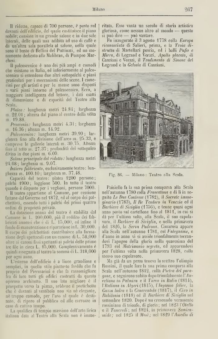 Il palcoscenico è uno dei più ampi e comodi che esistano in Italia, ed inferiormente al palcoscenico si estendono due altri sottopalchi e piani graticolati per i meccanismi delle scene. I camerini per gli artisti e per le masse sono disposti a varii piani intorno al palcoscenico. Ecco, a maggiore intelligenza del lettore, dati esatti di dimensione e di capacità del Teatro alla Scala.