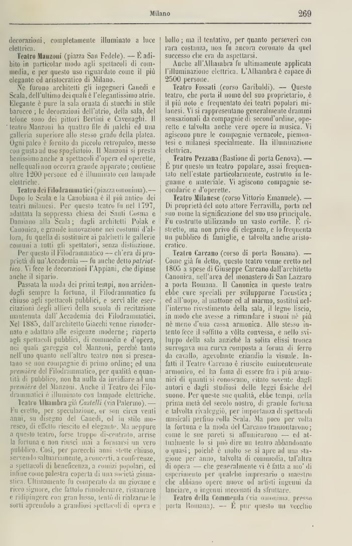 Teatro Milanese (corso Vittorio Emanuele). — Di proprietà del nolo attore Ferravi III! porta nel suo nome la significazione del suo uso principale. Fu costrutto utilizzando un vasto cortile. K ristretto, ina non privo di eleganza, e lo frequenta un pubblico di famiglie, e talvolta anche aristocratico.