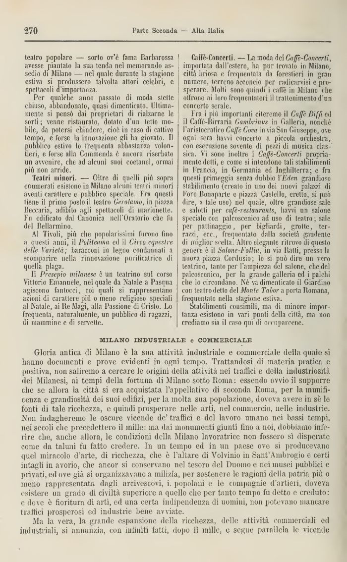 Fra i più importanti citeremo il Gaffe Biffi ed il Caffè-Binaria Gambrinvs in Galleria, nonché l'aristocratico Caffè Cova in via San Giuseppe, ove ogni sera havvi concerto a piccola orchestra, con esecuzione sovente di pezzi di musica classica. Vi sono inoltre i Caffè-Concerti propriamente detti, e come si intendono tali stabilimenti in Francia, in Germania ed Inghilterra; e fra questi primeggia senza dubbio \ Eden grandioso stabilimento (creato in uno dei nuovi palazzi di Foro Bonaparte e piazza Castello, eretto, sì può dire, a tale uso) nel quale, oltre grandiose sale e salotti per cafc-restauranls, havvi 1111 salone speciale con palcoscenico ad uso di teatro; sale per pattinaggio, per bigliardi, grotte, terrazzi. ecc., frequentato dalla società gaudente ili miglior scelta. Altro elegante ritrovo di questo genere è il Salonel'ollia, in via Batti, presso la nuova piazza Cordusio; lo si può dire un vero teatrino, tanto per l'ampiezza del salone, che del palcoscenico, per la grande galleria ed i palchi che lo circondano. Né va dimenticato il Giardino con teatro detto del Monte Tahnr a porta Romana, frequentato nella stagione estiva.