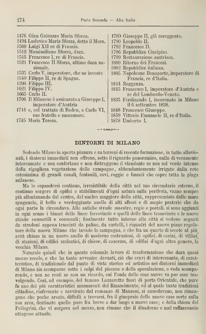 Naturale quindi che in questo colossale lavoro di trasformazione che dura quasi mezzo secolo, e che ha tanto avvenire davanti, ciò che aravi di interessante, di caratteristico, di tradizionale dal punto di vista storico ed artistico nei dintorni immediati di Milano sia scomparso sotto i colpi del piccone e della speculazione, o vada scomparendo, e non ne resti se non un ricordo, cui l'onda delle cose nuove va pur esso travolgendo. Così, ad esempio, del famoso Lazzaretto fuori di porta Orientale, che pure fu uno dei più caratteristici monumenti del Rinascimento, ed al quale tante tradizioni cittadine, rinfrescate e ravvivate dal romanzo di Manzoni, si annodavano, non rimangono che poche arcate, difficili a trovarsi, fra il ginepraio delle nuove case sorte sulla sua area, destinate quelle pure fra breve a dar luogo a nuove case; e della chiesa del Pellegrini, che vi sorgeva nel mezzo, non rimane che il disadorno e mal raffazzonato ottagono attuale.