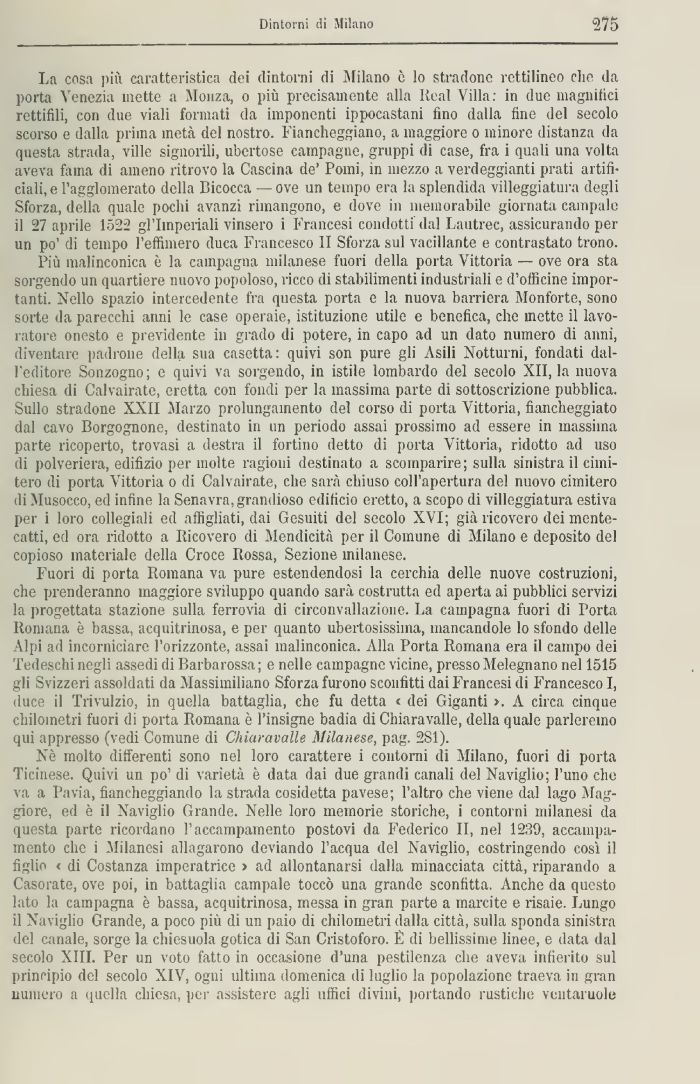 Fuori di porta Romana va pure estendendosi la cerchia delle nuove costruzioni, che prenderanno maggiore sviluppo quando sarà costrutta ed aperta ai pubblici servizi la progettata stazione sulla ferrovia di circonvallazione. La campagna fuori di Porta Romana è bassa, acquitrinosa, e per quanto ubertosissima, mancandole lo sfondo delle Alpi ad incorniciare l'orizzonte, assai malinconica. Alla Porta Romana era il campo dei Tedeschi negli assedi di Barbarossa; e nelle campagne vicine, pressoMelegnano nel 1515 gli Svizzeri assoldati da Massimiliano Sforza furono sconfitti dai Francesi di Francesco I, duce il Trivulzio, in quella battaglia, che fu detta < dei Giganti >. A circa cinque chilometri fuori di porta Romana è l'insigne badia di Chiara valle, della quale parleremo qui appresso (vedi Comune di Chiaravalle Milanese, pag. 2S1).