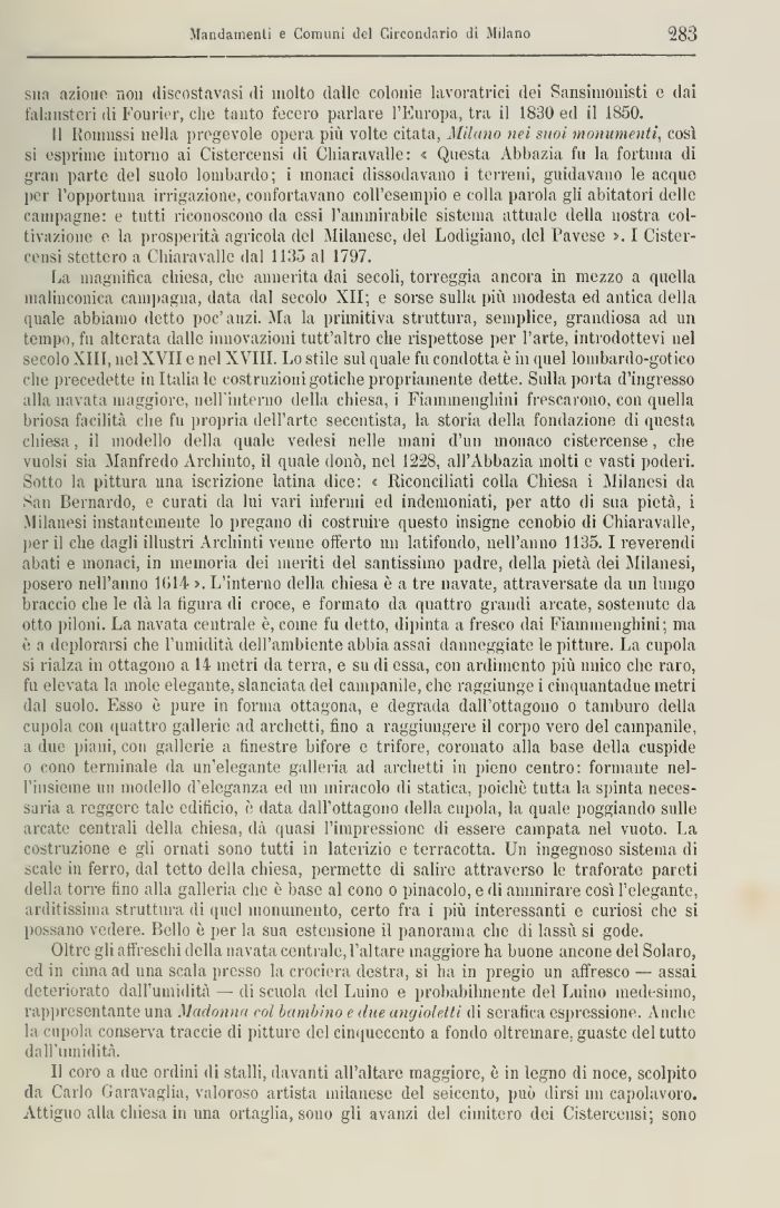 Il Hoiitnssi nella pregevole opera più volte citata, Milano nei suoi monumenti, così si esprime intorno ai Cistercensi ili Chiaravalle: < Questa Abbazia fu la fortuna di gran parte del suolo lombardo; i monaci dissodavano i terreni, guidavano le acque per l'opportuna irrigazione, confortavano coll'esenipio e colla parola gli abitatori delle campagne: e tutti riconoscono da essi raniinirabile sistema attuale della nostra coltivazione e la prosperità agricola del Milanese, del Lodìgiano, del Pavese >. I Cistercensi stettero a Chiaravalle dal 1135 al 1797.