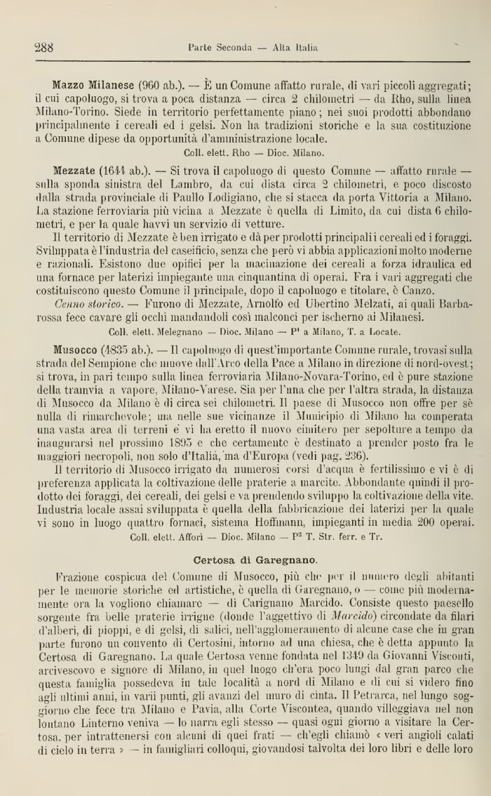 Musocco (4835 ab.). — Il capoluogo di quest'importante Connine rurale, trovasi sulla strada del Sempione che muove dall' Vito della Pace a Milano in direzione di nord-ovest; si trova, in pari tempo sulla linea ferroviaria Milano-Novara-Torino, ed è pure stazione della tramvia a vapore, Milano-Varese. Sia per l'unii che per l'altra strada, la distanza di Musocco da Milano è di circa sei chilometri. Il paese di Musocco non offre per sè nulla di rimarchevole; ma nelle sue vicinanze il Municipio di Milano lui comperata una vasta area di terreni é vi ha eretto il nuovo cimitero per sepolture a tempo da inaugurarsi nel prossimo 1895 e che certamente è destinato a prender posto fra le maggiori necropoli, non solo d'Italia, ma d'Europa (vedi pag. 230).