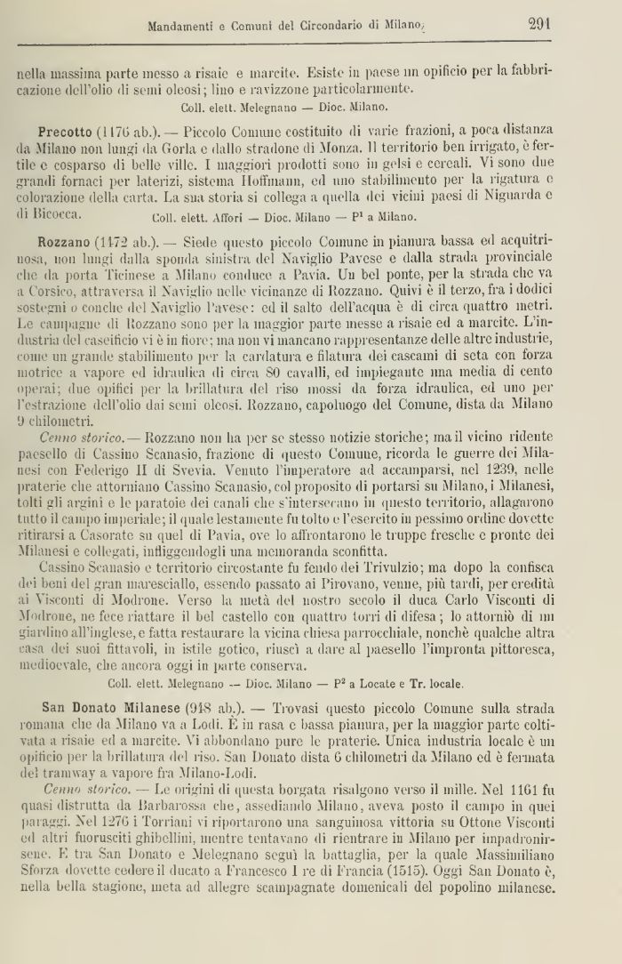 Rozzano (117:2 ab.).— Siede questo piccolo Comune in pianura bassa ed acquitrinosa, non lungi dulia sponda sinistra del Naviglio Pavese e dalla strada provinciale che ila porta Ticinese a Milano conduce a Pavia. Un bel ponte, per la strada che va a Corsico, attraversa il Naviglio nelle vicinanze di Rozzano. Quivi è il terzo, fra i dodici sostegni o conche del Naviglio Pavese: ed il salto dell'acqua è di circa quattro metri. Le campagne di Rozzano sono per la maggior parte messe a risaie ed a marcite. L'industria del caseificio vi è in fiore; ma non vi mancano rappresentanze delle altre industrie, come un grande stabilimento per la cardatura e filatura dei cascami di seta con forza motrice a vapore ed idraulica di circa SO cavalli, ed impiegante ima media di cento operai; due opifici per la brillatura del riso mossi da forza idraulica, ed uno per l'estrazione dell'olio dai semi oleosi. Rozzano, capoluogo del Comune, dista da Milano 'J chilometri.