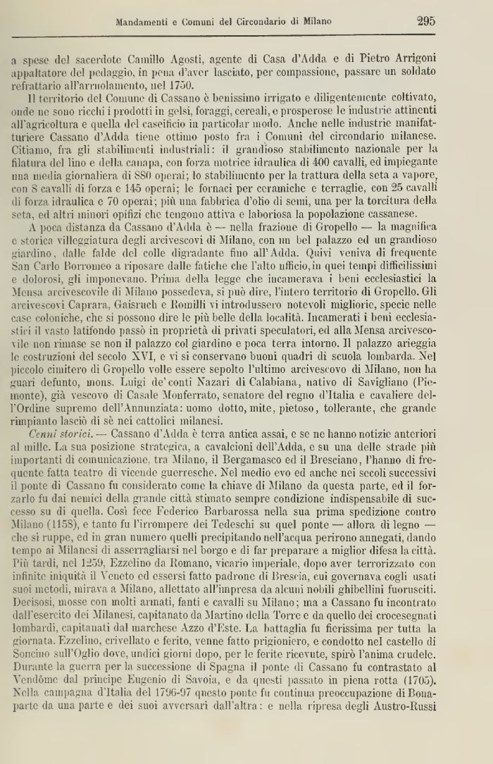 A poca distanza da Cassano d'Adda è — nella frazione di Gropello — la magnifica e storica villeggiatura degli arcivescovi di Milano, con un bel palazzo ed un grandioso giardino, dalle falde del colle digradante fino all'Adda. Quivi veniva di frequente San Carlo Borromeo a riposare dalle fatiche che l'alto ufficio, in quei tempi difficilissimi e dolorosi, gli imponevano. Prima della legge che incamerava i beni ecclesiastici la Mensa arcivescovile di Milano possedeva, si può dire, l'intero territorio ili Gropello. Gli arcivescovi Caprara, Gaisruch e Bomilli vi introdussero notevoli migliorie, specie nelle case coloniche, che si possono dire le più belle della località. Incamerati i beni ecclesia-stiri il vasto latifondo passò in proprietà di privati speculatori, ed alla Mensa arcivescovile non rimase se non il palazzo col giardino e poca terra intorno. 11 palazzo arieggia le costruzioni del secolo XVI, e vi si conservano buoni quadri di scuola lombarda. Nel piccolo cimitero di Gropello volle essere sepolto l'ultimo arcivescovo di Milano, non ha guari defunto, mons. Luigi de'conti Nazari di Calabiana, nativo di Savigliano (Piemonte), già vescovo ili Casale Monferrato, senatore del regno d'Italia e cavaliere dell'Ordine supremo dell'Annunziata: uomo dotto, mite, pietoso, tollerante, che grande rimpianto lasciò di sè nei cattolici milanesi.