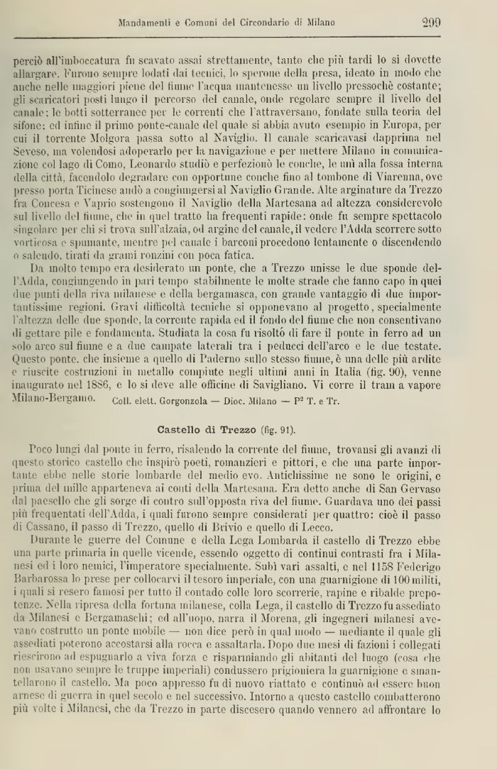 1 Adda, congiungemlo in pari tempo stabilmente le molte strade che fanno capo in quei due punti della riva milanese e della bergamasca, con grande vantaggio di due importantissime regioni. Gravi difficoltà tecniche si opponevano al progetto, specialmente l'altezza delle due sponde, la corrente rapida ed il fondo del fiume che 11011 consentivano ili gettare pile e fondamenta. Studiata la cosa fu risolto di fare il [tonte in ferro ad un solo arco sul fiume e a due campate laterali tra i peducci dell'arco e le due testate. Questo ponte, che insieme a quello ili Paderno sullo stesso fiume, è una delle più ardite e riuscite costruzioni in metallo compiute negli ultimi anni in Italia (fig. DO), venne inaugurato nel 18S6, e lo si deve alle officine di Savigliano. Vi corre il tram a vapore Milano-Bergamo. Cùll_ elelt> Gorgonzola — Dioc. Milano — P- T. e Tr.