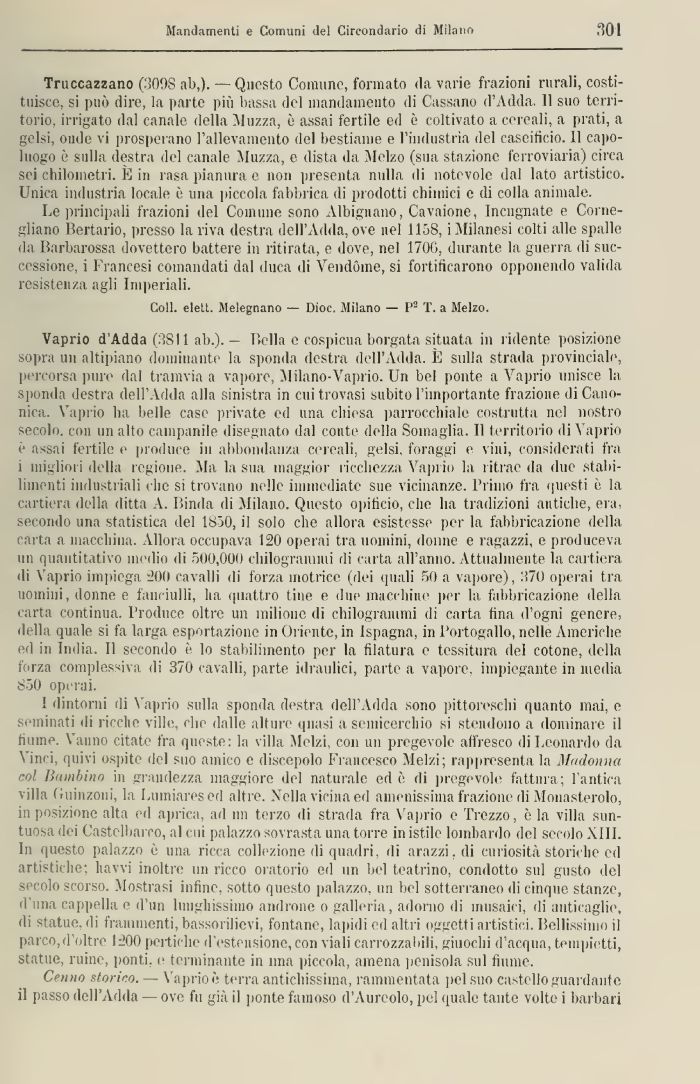 I dintorni di Vaprio sulla sponda destra dell'Adda sono pittoreschi quanto inai, e seminati di ricche ville, che dalle alture quasi a semicerchio si stendono a dominare il fiume. Vanno citate fra queste; la villa Melzi, con un pregevole affresco di Leonardo da Vinci, quivi ospite del suo amico e discepolo Francesco Melzi; rappresenta la Madonna col Bambino in grandezza maggiore del naturale ed è. di pregevole fattura; l'antica villa (uiinzoni. la Lmniares ed altre. Velia vicina ed ainenissima frazione di Monasterolo, in posizione alta ed aprica, ad mi terzo di strada fra Vaprio e 'Prezzo, è la villa «untuosa dei Castelbarco, al cui palazzo sovrasta una torre in ist.ile lombardo del secolo XIII. In questo palazzo è una ricca collezione di quadri, ili arazzi, di curiosità storielle ed artistiche; havvi inoltre un ricco oratorio ed un bel teatrino, condotto sul gusto del secolo scorso. Mostrasi infine, sotto questo palazzo, un bel sotterraneo di cinque stanze, d'una cappella e d'un lunghissimo androne o galleria, adorno di musaici, di anticaglie, di statue, di frammenti, bassorilievi, fontane, lapidi ed altri oggetti artistici. Bellissimo il parco,d'oltre 1200 pertiche d'estensione,con viali carrozzabili, giuochi d'acqua, tempietti, statue, mine, ponti, e terminante iu una piccola, amena penisola sul fiume,