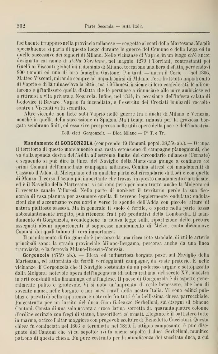 Mandamento di GORGONZOLA (comprende 19 Comuni, popol. 38,556 ab.). - Occupa il territorio di questo mandamento una vasta estensione di campagne pianeggianti, che va dalla sponda destra dell'Adda all'estremo limite del circondario milanese (Cornate) e seguendo si può dire la linea del Naviglio della Martesana giunge a confinare coi primi Comuni dell'immediata campagna milanese. Confina altresì coi mandamenti di Cassano d'Adda, di Melegnano ed in qualche parte col circondario di Lodi e con quello di Monza. Il corso d'acqua piti importante che trovasi in questo mandamento è artificiale, ed è il Naviglio della Martesana; vi corrono però per buon tratto anche la Molgora ed il recente canale Villoresi. Nella parte di nord-est il territorio perde la sua fiso-nomia di rasa pianura per assumere quella di terreno leggiermente ondulato: ondulazioni che si accentuano verso nord e verso le sponde dell'Adda con piccole alture di natura piuttosto sassosa. Ma in generale il suolo e fertile, e specie nella parte bassa abbondantemente irrigato, può ritenersi fra i più produttivi della Lombardia, Il mandamento di Gorgonzola, avendogliene la nuova legge sulla ripartizione delle preture assegnati alcuni appartenenti al soppresso mandamento di Melzo, conta diciannove Comuni, dei quali taluno di vera importanza.