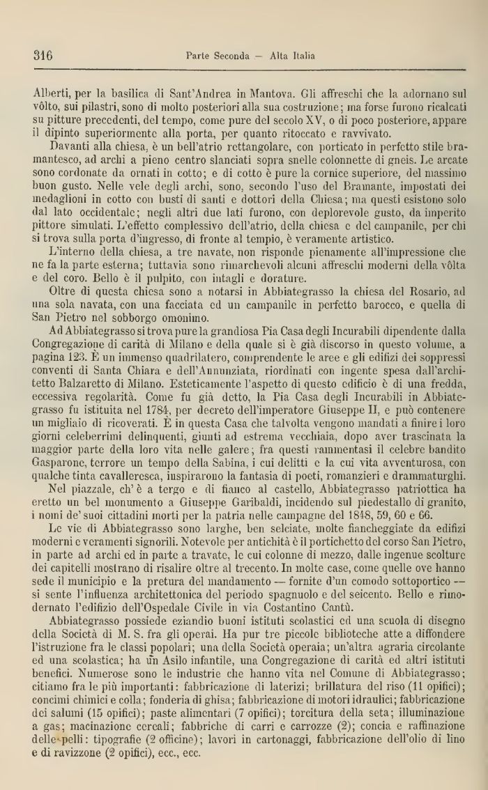 Ad Abbiategrasso si trova pure la grandiosa Pia Casa degli Incurabili dipendente dalla Congregazione di carità di Milano e della quale si è già discorso in questo volume, a pagina 123. E un immenso quadrilatero, comprendente le aree e gli edifizi dei soppressi conventi di Santa Chiara e dell'Annunziata, riordinati con ingente spesa dall'architetto Balzaretto di Milano. Esteticamente l'aspetto di questo edificio è di una fredda, eccessiva regolarità. Come fu già detto, la Pia Casa degli Incurabili in Abbiategrasso fu istituita nel 1784, per decreto dell'imperatore Giuseppe II, e può contenere un migliaio di ricoverati. E in questa Casa che talvolta vengono mandati a finire i loro giorni celeberrimi delinquenti, giunti ad estrema vecchiaia, dopo aver trascinata la maggior parte della loro vita nelle galere ; fra questi rammentasi il celebre bandito Gasparone, terrore un tempo della Sabina, i cui delitti e la cui vita avventurosa, con qualche tinta cavalleresca, inspirarono la fantasia di poeti, romanzieri e drammaturghi.