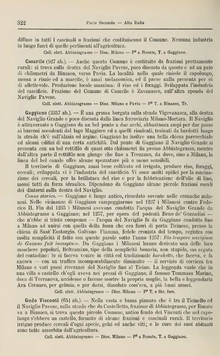 Gaggiano (3357 ab.). — E una grossa borgata sulla strada Vigevanasca, alla destra del Naviglio Grande e poco discosta dalla linea ferroviaria Milano-Mortara. 11 Naviglio è attraversato a Gaggiano da un bel ponte a due archi, abbastanza ampi per dar passo ai barconi scendenti dal lago Maggiore ed a quelli risalenti, trainati da bardotti lungo la strada ch'è sull'alzaia od argine. Saggiano ha inoltre una bella chiesa parrocchiale ed alcuni edilizi di una certa antichità. Dal ponte di Gaggiano il Naviglio Grande si presenta con un bel rettifilo di quasi otto chilometri fin presso Abbiategrasso, mentre dall'altra parte il rettifilo non giunge che lino a 'Prezzano, da dove, sino a Milano, la linea del bel canale offre alcune spezzature più o meno sensibili.