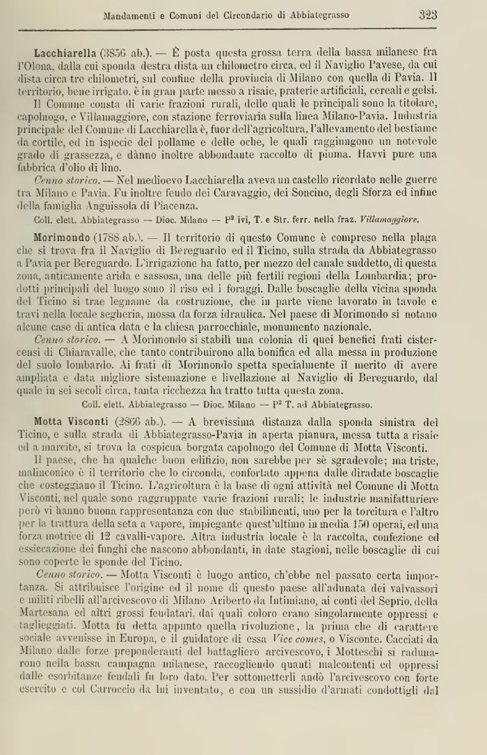 Cenno storico. — A Morimondo si stabilì una colonia di quei benefici frati cistercensi dì Chiaravalle, che tanto contribuirono alla bonifica ed alla messa 111 produzione del suolo lombardo. Ai frati di Morimondo spetta specialmente il inerito di avere ampliata e data migliore sistemazione e livellazione al Naviglio di Bereguardo, dal quale iu sei secoli circa, tanta ricchezza ha tratto tutta questa zona.