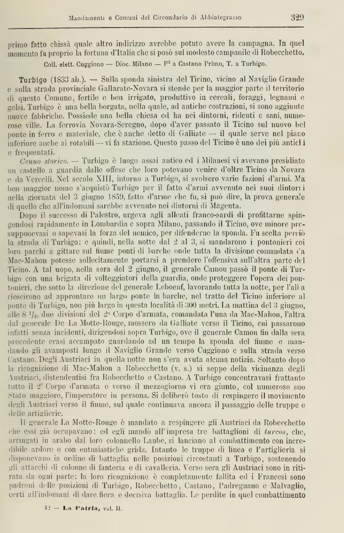 Cenno storico. — Turbigo è luogo assai antico ed i Milanesi vi avevano presidiato un castello a guardia dalle offese che loro potevano venire d'oltre Ticino (la Novara e da \ ercelli. Nel secolo XIII, intorno a Turbigo, si svolsero varie, fazioni d'armi. Ara ben maggior nome s'acquistò Turbigo per il fatto d'anni avvenuto nei suoi dintori i nella giornata del 3 giugno 1859, fatto d'arnie che fu, si può dire, la prova generale di quello che all'indomani sarebbe avvenuto nei dintorni di Magenta.