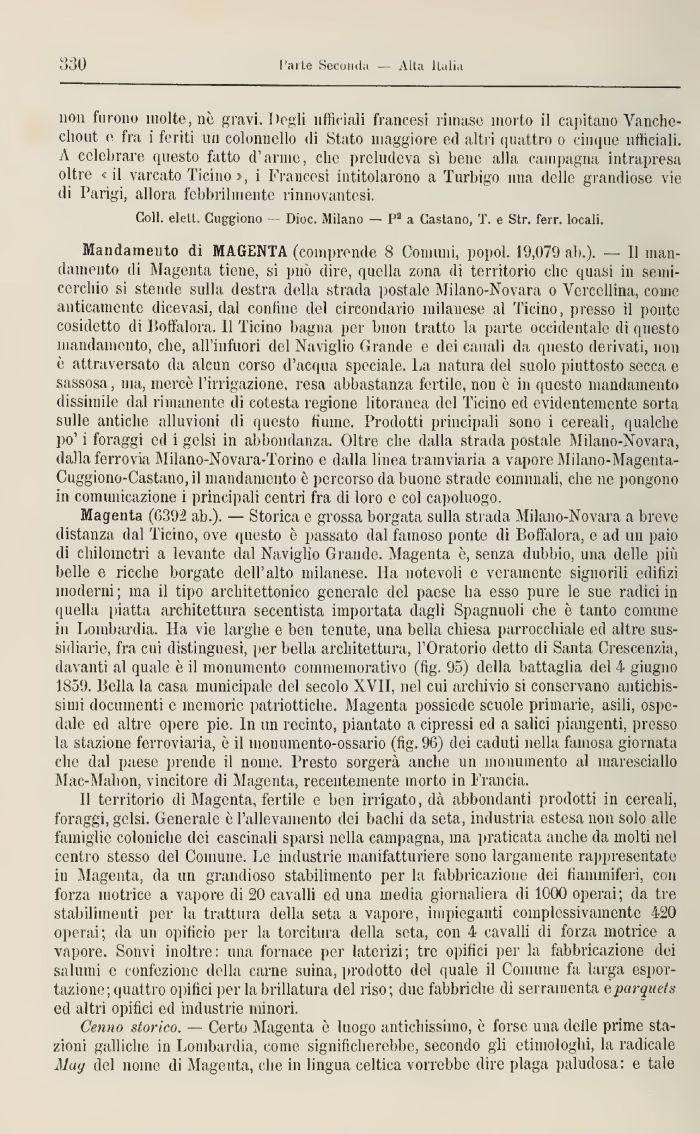 Cenno storico. — Certo Magenta è luogo antichissimo, è l'orse una delle prime stazioni galliche m Lombardia, come significherebbe, secondo gli etimologia, la radicale May del nome di Magenta, che in lingua celtica vorrebbe dire plaga paludosa: e tale