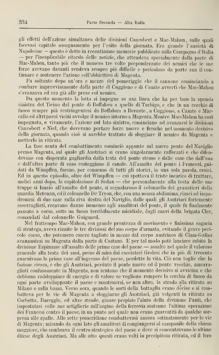 Nel frattempo Mac-Mahon, con grande prontezza di movimento e finissima sagacia di stratega, aveva riunite le tre divisioni del suo corpo d'armata, evitando il grave pericolo corso, che potessero essere tagliate in mezzo dal corpo austriaco di Clani-Gallas avanzantesi su Magenta dalla parte di Castano. E per tal modo potè lanciare subito la divisione Espinasse all'assalto delle prime case del paese — assalto nel quale il valoroso generale alla testa dei suoi, preso di mira dai cacciatori tirolesi che m più di trecento guarnivano le prime case all'ingresso del paese, perdette la vita. Ciò non toglie che la fazione riesca, e che gli Austriaci, perduto il ponte nuovo ed il ponte vecchio, asserragliati confusamente in Magenta, non sentano che il momento decisivo si avvicina e che debbono raddoppiare di energia e di valore se vogliono rompere la cerchia di fuoco da ogni parte avviluppante il paese e mantenersi, se non altro, la strada alla ritirata su Milano e sulla bassa. Verso sera, quando le sorti della battaglia erano decise e si combatteva per le vie di Magenta a sloggiarne gli Austriaci, già volgenti 111 ritirata su Corbellai Pareggio, ed altre strade, giunse propizio l'aiuto della divisione Fanti, clic impostatasi colle sue artiglierie sull'argine della ferrovia sostenne l'ultima operazione dei Francesi contro il paese, 1111111 punto nel quale non erano guarentiti da qualche sorpresa alle spalle. Alle sette pomeridiane combattevasi ancora ostinatamente per le vie di Magenta; mirando da ogni lato gli assalitori di congiungersi al campanile della chiesa maggiore, che sembrava il centro strategico del paese e dove si concentravano le ultime difese degli Austriaci. Ma alle otto questi erano volti in precipitosa ritirata, ed il loro