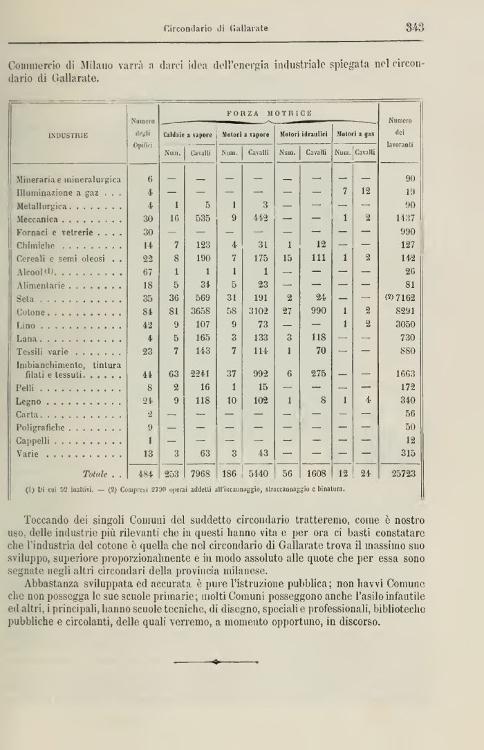 Toccando dei singoli Comuni del suddetto circondario tratteremo, come e nostro uso, delle industrie piω rilevanti che in questi hanno vita e per ora ci basti constatare che l'industria del cotone θ quella che nel circondario di Gallarate trova il massimo suo sviluppo, superiore proporzionalmente e in modo assoluto alle quote che per essa sono segnate negli altri circondari della provincia milanese.