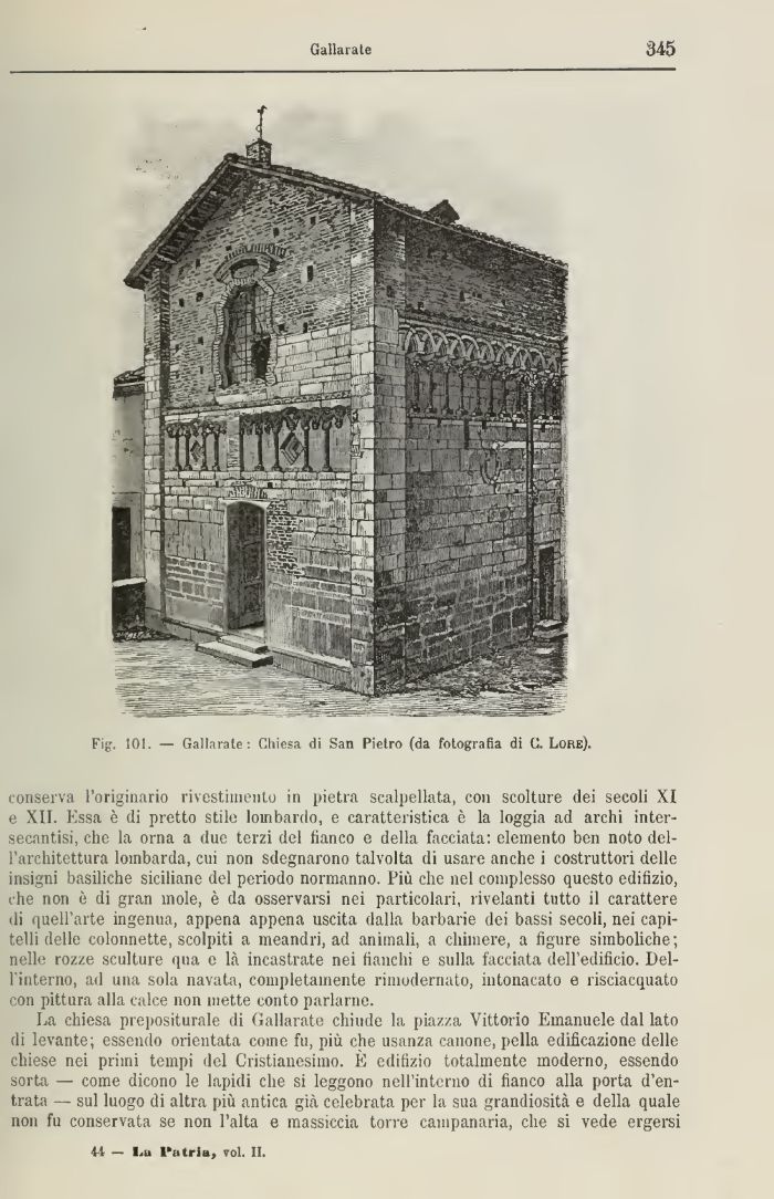 conserva l'originario rivestimento in pietra scalpellata, con scolture dei secoli XI e XII. Essa è di pretto stile lombardo, e caratteristica è la loggia ad archi inter-secantisi, che la orna a due terzi del fianco e della facciata: elemento ben noto dell'architettura lombarda, cui non sdegnarono talvolta di usare anche i costruttori delle insigni basiliche siciliane del periodo normanno. Più che nel complesso questo edifizio, che non è di gran mole, è da osservarsi nei particolari, rivelanti tutto il carattere di quell'arte ingenua, appena appena uscita dalla barbarie dei bassi secoli, nei capitelli delle colonnette, scolpiti a meandri, ad animali, a chimere, a figure simboliche; nelle rozze sculture qua e là incastrate nei fianchi e sulla facciata dell'edificio. Dell'interno, ad una sola navata, completamente rimodernato, intonacato e risciacquato con pittura alla calce non mette conto parlarne.