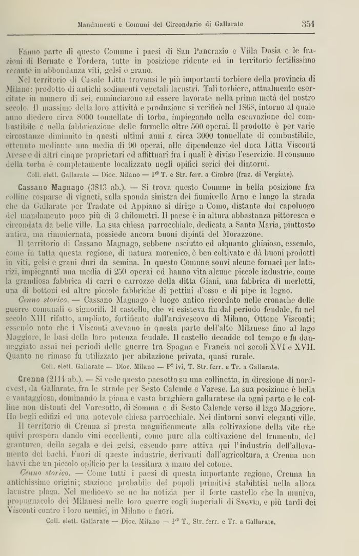 Cassano Magnago (3813 ab.). — Si trova questo Comune in bella posizione fra colline cosparse di vigneti, sulla sponda sinistra del tiuniicello Arno e lnngo la strada che da Gallarate per Tradate ed Appiano si dirige a Como, distante dal capoluogo del mandamento poco più di 3 chilometri. 11 paese è in altura abbastanza pittoresca e circondata da belle ville. La sua chiesa parrocchiale, dedicata a Santa Maria, piuttosto antica, ma rimodernata, possiede ancora buoni dipinti del Morazzone.