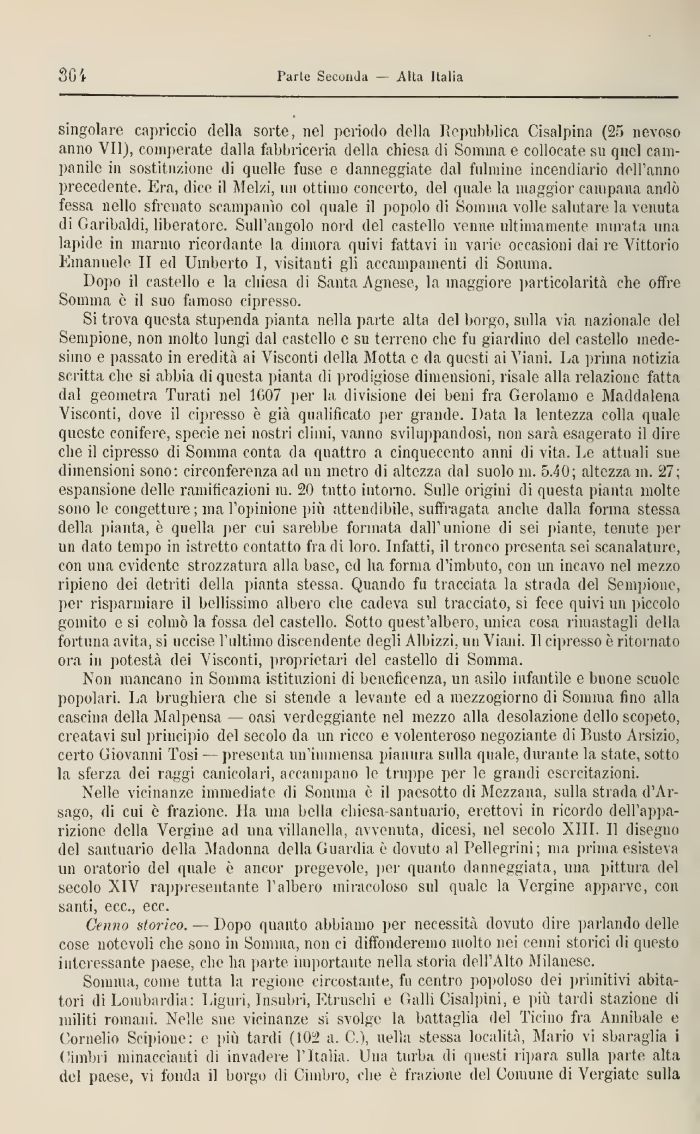Si trova questa stupenda pianta nella parte alta del borgo, sulla via nazionale del Sempione, non molto lungi dal castello e su terreno che fu giardino del castello medesimo e passato in eredità ai Visconti della Motta e da questi ai Viani, La prima notizia scritta che si abbia di questa pianta di prodigiose dimensioni, risale alla relazione fatta dal geometra Turati nel 1007 per la divisione dei beni fra Gerolamo e Maddalena Visconti, dove il cipresso è già qualificato per grande. Data la lentezza colla quale queste conifere, specie nei nostri climi, vanno sviluppandosi, non sarà esagerato il dire che il cipresso di Somma conta da quattro a cinquecento anni di vita. Le attuali sue dimensioni sono: circonferenza ad 1111 metro di altezza dal suolo 111. 5.40; altezza 111. 27; espansione delle ramificazioni ìu. 20 tutto intorno. Sulle origini di questa pianta molte sono le congetture ; ma l'opinione pili attendibile, suffragata anche dalla forma stessa della pianta, è quella per cui sarebbe formata dall'unione di sei piante, tenute per un dato tempo in istretto contatto fra dì loro. Infatti, il tronco presenta sei scanalature, con una evidente strozzatura alla base, ed ha forma d'imbuto, con 1111 incavo nel mezzo ripieno dei detriti della pianta stessa. Quando fu tracciata la strada del Sempione, pei! risparmiare il bellissimo albero che cadeva sul tracciato, si fece quivi 1111 piccolo gomito e si colmò la fossa del castello. Sotto quest'albero, unica cosa rimastagli della fortuna avita, si uccise l'ultimo discendente degli Albizzi, 1111 Viani. 11 cipresso è ritornato ora in potestà dei Visconti, proprietari del castello dì Somma.