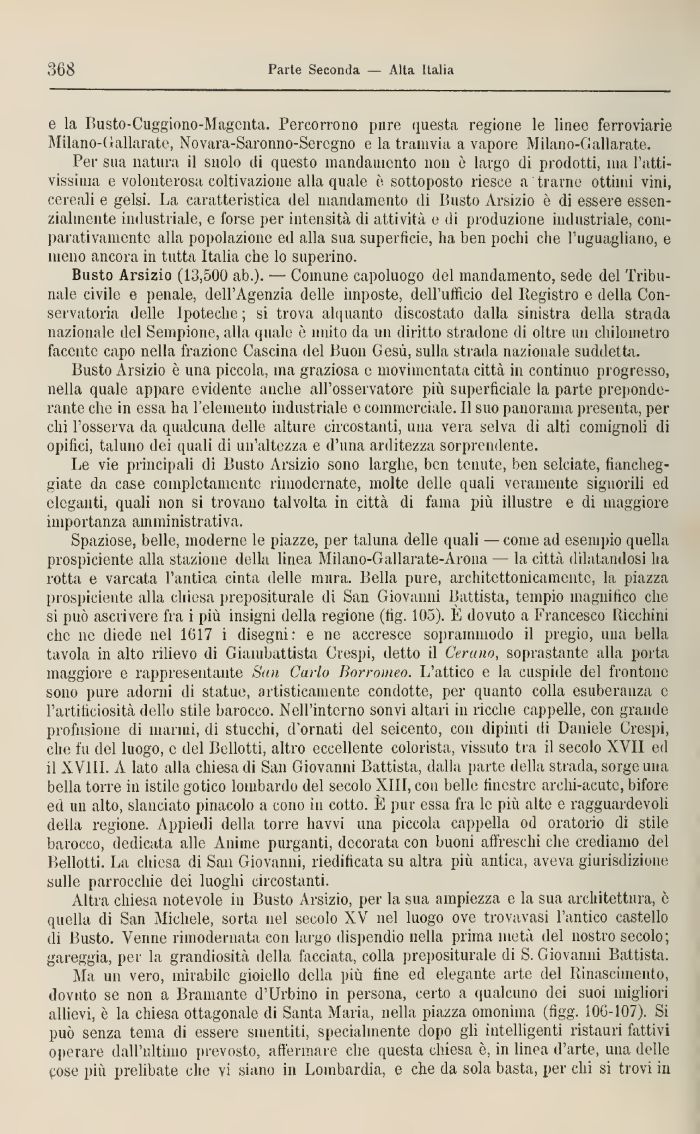 Spaziose, belle, moderne le piazze, per taluna delle quali —corri e ad esempio quella prospiciente alla stazione della linea Milano-Ga 11 arate-A rona — la città dilatandosi ha rotta e varcata l'antica cinta delle unirà. Bella pure, architettonicamente, la piazza prospiciente alla chiesa prepositurale di San Giovanni Battista, tempio magnifico che si può ascrivere fra i più insigni della regione (fig. 105). E dovuto a Francesco Ricchini che ne diede nel 1617 i disegni: e ne accresce sopraininodo il pregio, mia bella tavola in alto rilievo di Giambattista Crespi, detto il Cerano, soprastante alla porta maggiore e rappresentante San Carlo Borromeo. L'attico e la cuspide del frontone sono pure adorni di statue, artisticamente condotte, per quanto colla esuberanza e l'artificiosità dello stile barocco. Nell'interno sonvi altari in ricche cappelle, con granile profusione di marini, di stucchi, d'ornati del seicento, con dipinti di Daniele Crespi, che fu del luogo, e del Belletti, altro eccellente colorista, vissuto tra il secolo XVII ed il XVIIL A lato alla chiesa di San Giovanni Battista, dalla parte della strada, sorge una bella torre in istile gotico lombardo del secolo XIII, con belle finestre archi-acute, bifore ed un alto, slanciato pinacolo a cono in cotto. È pur essa fra le più alte e ragguardevoli della regione. Appiedi della torre havvi una piccola cappella od oratorio di stile barocco, dedicata alle Anime purganti, decorata con buoni affreschi che crediamo del Belletti. La chiesa di San Giovanni, riedificata su altra più antica, aveva giurisdizione sulle parrocchie dei luoghi circostanti.