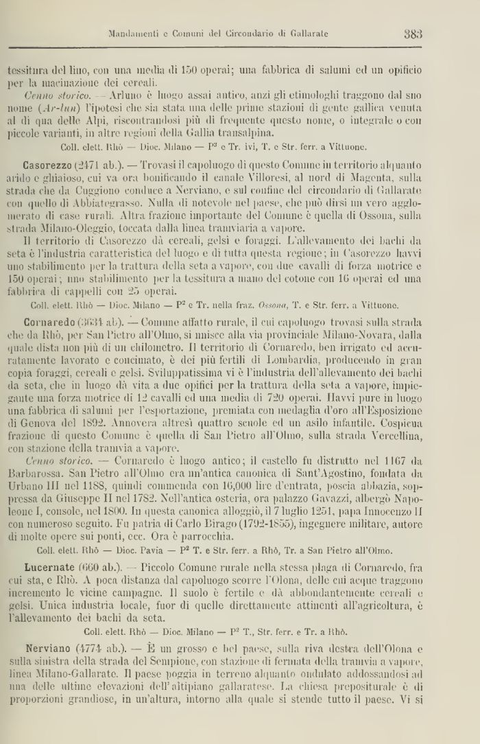 Casorezzo (2171 ab.). — Trovasi il capoluogo di questo Comune in territorio alquanto arido e ghiaioso, cui va ora bonificando il canale \'diuresi, al fiord di Magenta, sulla strada che da Cuggiono conduce a Xerviano, e sul contine del circondario ili Gallarate con quello di Abbiategrasso. Nulla di notevoli nel paese, che può dirsi ini vero agglomerato di case rurali. Altra frazione importante del Comune è quella di Ossomi, sulla strada Milaiio-Oleggio, toccata dalla linea tramviaria a vapore.
