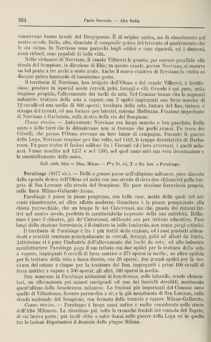 Parabiago (1-S77 ab.). — Bello e grosso paese nell'altipiano milanese, poco discosto dalla sponda destra dell'Olona ed unito con una strada di circa due chilometri pella borgata di San Lorenzo alla strada del Sempione. Ha pure stazione ferroviaria propria, sulla linea Milano-Gallarate-Arona.
