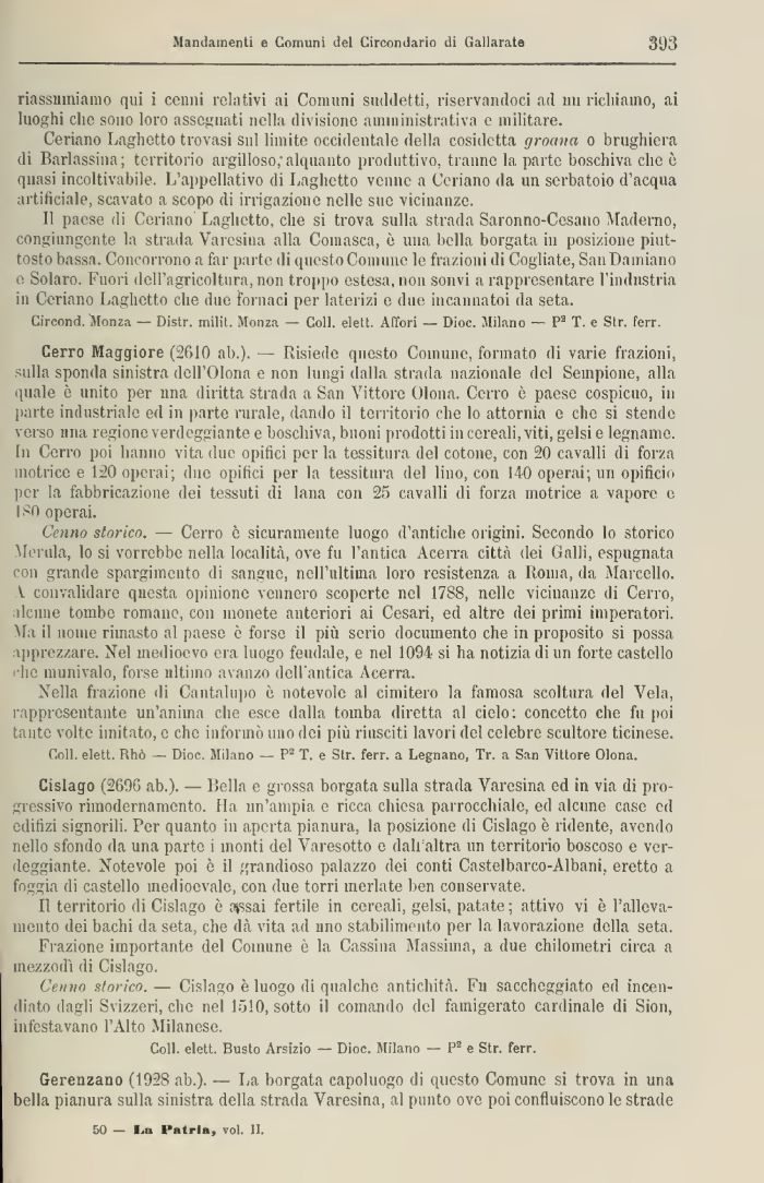 Cerro Maggiore (2610 ab.). — Risiede questo Comune, formato di varie frazioni, sulla sponda sinistra dell'Olona e non lungi dalla strada nazionale del Sempione, alla quale è unito per una diritta strada a San Vittore Olona. Cerro è paese cospicuo, in parte industriale ed in parte rurale, dando il territorio che lo attornia e che si stende verso lina regione verdeggiante e boschiva, buoni prodotti in cereali, viti, gelsi e legname-In Cerro poi hanno vita due opifici per la tessitura del cotone, con 20 cavalli di forza motrice e 120 operai; due opifici per la tessitura del lino, con 140 operai; un opificio per la fabbricazione dei tessuti di lana con 25 cavalli di forza motrice a vapore e 180 operai.