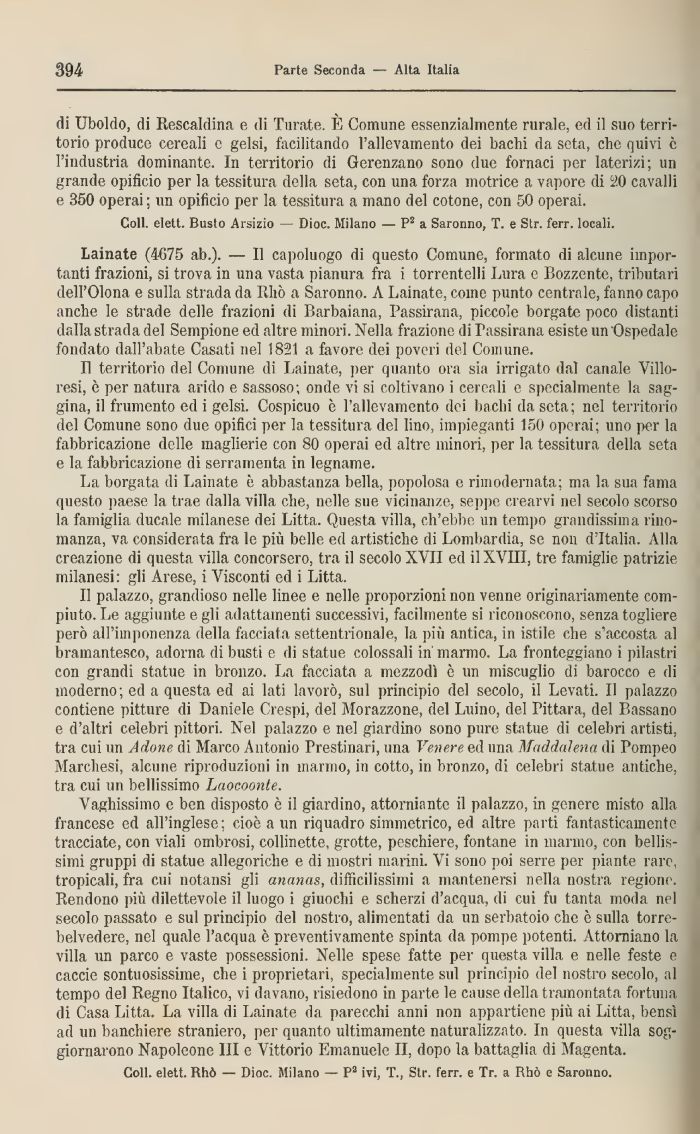 La borgata di Lainate è abbastanza bella, popolosa e rimodernata; ma la sua fama questo paese la trae dalla villa che, nelle, sue vicinanze, seppe crearvi nel secolo scorso la famiglia ducale milanese dei Litta. Questa villa, ch'ebbe un tempo grandissima rinomanza, va considerata fra le più belle ed artistiche di Lombardia, se non d'Italia. Alla creazione di questa villa concorsero, tra il secolo XVII ed il XVIII, tre famiglie patrizie milanesi: gli Arese, i Visconti ed i Litta.