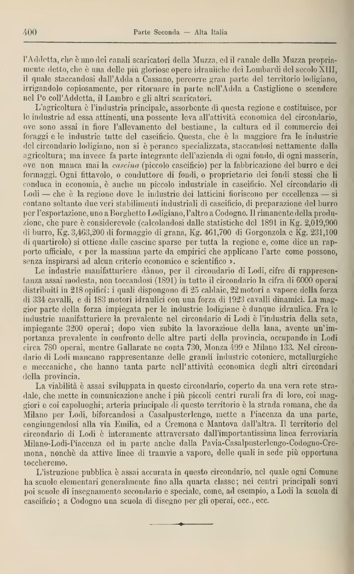 L'agricoltura è l'industria principale, assorbente di questa regione e costituisce, per le industrie ad essa attinenti, una possente leva all'attività economica del circondario, ove sono assai 111 fiore l'allevamento del bestiame, la cultura ed il commercio dei foraggi e le industrie tutte del caseificio. Questa, che e la maggiore fra le industrie del circondario lodigiano, 11011 si è peranco specializzata, staccandosi nettamente dalla agricoltura; ma invece fa parte integrante dell'azienda di ogni fondo, di ogni masseria, ove non manca mai la cascina (piccolo caseificio) per la fabbricazione, del burro e dei formaggi. Ogni fittavolo, 0 conduttore di fondi, 0 proprietario dei fondi stessi che li conduca in economia, è anche un piccolo industriale in caseificio. Nel circondario di Lodi — che è la regione dove le industrie dei latticini fioriscono per eccellenza — si contano soltanto due veri stabilimenti industriali di caseificio, di preparazione, del burro per l'esportazione, uno a Borghetto Lodigiano, l'altro a Codogno. Il rimanente della produzione, clic pure è considerevole (calcolandosi dalle statistiche del 1801 in Kg. 2,010,900 di burro, Kg. 3,403,200 di formaggio di grana, Kg. 401,700 di Gorgonzola e Kg. 231,100 di quartirolo) si ottiene dalle cascine sparse per tutta la regione e, come dice un rapporto ufficiale, « per la massima parte da empirici che applicano l'arte come possono, senza inspirarsi ad alcun criterio economico e scientifico >.