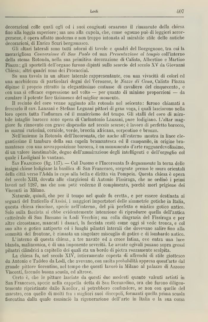 San Francesco (fig. 117). — Col Duomo e l'Incoronata fa degnamente la terna delle insigni chiese lodigiane la basilica di San Francesco, sorgente presso le mura orientali della città verso l'Adda in capo alla bella e diritta via fompeia. Questa chiesa è opera del secolo XIII, dovuta alle elargizioni (li Antonio Fissiraga, che ne ordinò i primi lavori nel 1287, ma che non potò vederne 11 compimento, perchè morì prigione dei Visconti Ì11 Milano.