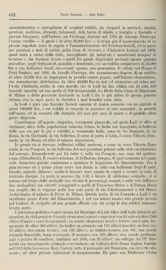 In queste vie si trovano bellissimi edilizi moderni, e come in corso Vittorio Emanuele, in via Pompeia, in via Solferino dei veri grandiosi palazzi nello stile caratteristico del seicento. Rimarchevole poi fra tutte è, nella via Pompeia, una casa del quattrocento (Gliisalberti). E conservatissinia, di bellissimo disegno, di quel momento nel quale sulle simmetrie gotiche cominciano a spuntare le leggiadrie del Rinascimento. Fra il pian terreno ed il primo piano corre una fascia in cotto con bellissimi fregi di putti, frasche, animali, chimere ; anche le finestre sono ornate da stipiti o cornici incotto di ricercato disegno. La porta in marmo (fig. 118) è lavoro di abilissimo scalpello : vi si notano nel fregio delle medaglie con ritratti di personaggi romani, e sulle vele dell'arco due medaglioni con ritratti arieggiatiti a quelli di Francesco Sforza e di Bianca Maria sua moglie, che si veggono nelle ben note porte di via Filodrammatici e del Museo Archeologico al palazzo di Brera 111 Milano. Questa porta di via Pompeia a Lodi è 1111 eccellente pezzo d'arte del Rinascimento, e nel suo autore mostra una grande perizia nel trattare di scalpello ed una grande affinità con chi scolpì le due celebri suiiimen-tovate porte.