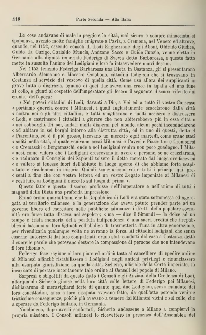 Le cose andavano di male in peggio e la città, mal sicura e sempre minacciata, si spopolava, avendo molte famiglie emigrato a Pavia, a Cremona, nel Veneto ed altrove, quando, nel 1152, essendo consoli di LodiEnghezzone degli Àboni, Oldrado Giudice, Guido da Cuzigo, Garialdo Muncio, Amizone Sacco e Guido Cunzio, venne eletto in Germania alla dignità imperiale Federigo di Svevia detto Barbarossa, e questo fatto mette in sussulto l'animo dei Lodigiani e loro fa intravvedere nuovi destini.