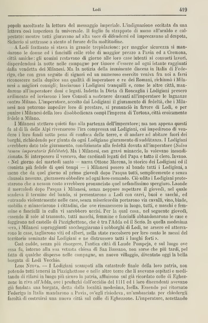 I Milanesi stettero quieti lino alla partenza dell'imperatore; ma non appena questi fu al di là delle Alpi riversarono Tira compressa sui Lodigiani, cui impedirono di vendere i loro fondi sotto pena di confisca delle terre, e di andare ad abitare fuori dei borghi, richiedendo per giunta da ogni Lodigiano giuramento di sudditanza. I Lodigiani avrebbero dato tale giuramento, condizionato alla fedeltà dovuta all'imperatore (Salva /amen hnperatoris fìdelitate). Ma i Milanesi, con gravi minaccia, lo volevano incondi zionato. Si interposero il vescovo, due cardinali legati del Papa e tutto il clero. Invano, t Nel giorno del martedì santo — narra Ottone Morena, lo storico dei Lodigiani ed il cronista più fedele di quei tempi — i Milanesi posero al bando tutti i Lodigiani, a meno che da quel giorno al primo giovedì dopo Pasqua tutti, semplicemente e senza clausola nessuna, giurassero obbedire ad ogni loro comando. Ciò udito i Lodigiani protestarono che a nessun costo avrebbero pronunciato quel nefandissimo spergiuro. Laonde il mercoledì dopo Pasqua i Milanesi, senza neppure aspettare il giovedì, nel quale scadeva il termine del bando, si presentarono a Lodi con carri, buoi e sacchi, ed entrando violentemente nelle case, senza misericordia portarono via cavalli, vino, biade, mobilia e minacciarono i cittadini, che ove rimanessero in luogo, tutti, e maschi e femmine e fanciulli in culla vi sarebbero uccisi. Per la qual cosa, nel seguente giovedì, essendo il sole al tramonto, tutti maschi, femmine e fanciulli abbandonarono le case e fuggirono nel castello di Pizzighettone, che è tra l'Adda ed il Serio. In quella medesima sera, i Milanesi sopraggiunti saccheggiarono i sobborghi di Lodi, ne arsero ed atterrarono le case, tagliarono viti ed alberi, nella state raccolsero per loro conto le messi del territorio seminate dai Lodigiani e ne distrussero tutti i luoghi forti >.